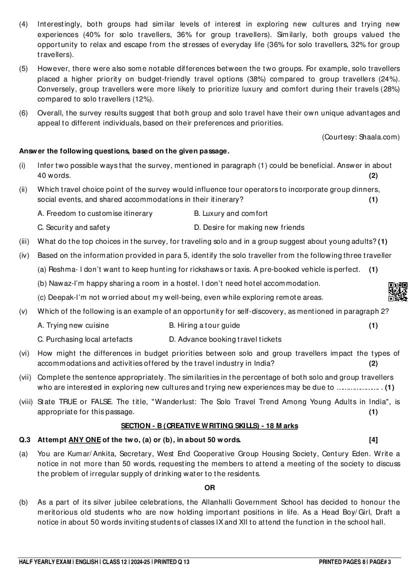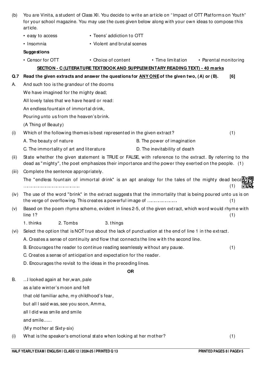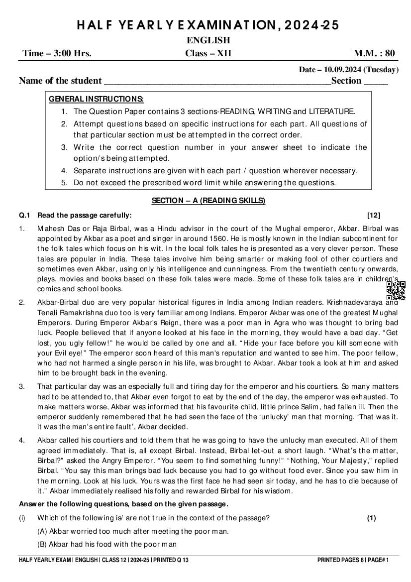 Class 12 English Half Yearly Question Paper 2025
