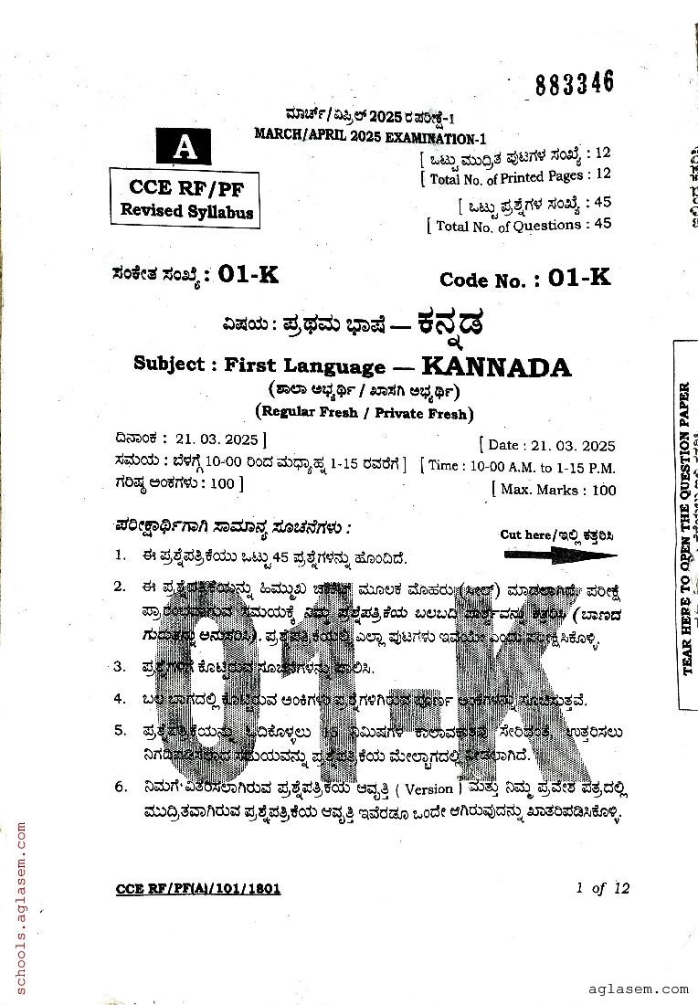 Karnataka SSLC Kannada First Language Question Paper 2025