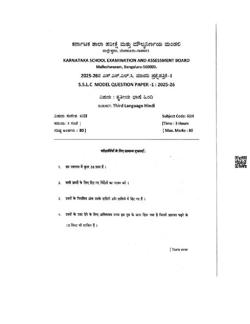 Karnataka SSLC Model Question Paper 2026 Hindi TL View Download