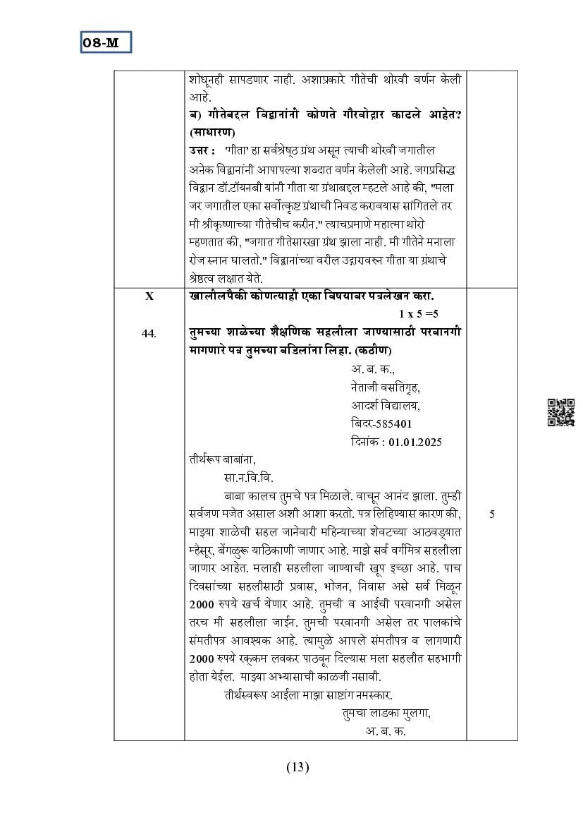 Karnataka SSLC Marathi Model Question Paper 2025 Download Link – Click Here to Download PDF