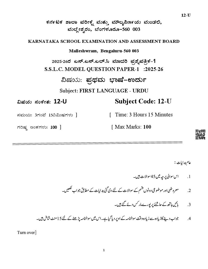 Karnataka SSLC Urdu First Language Model Question Paper 2026