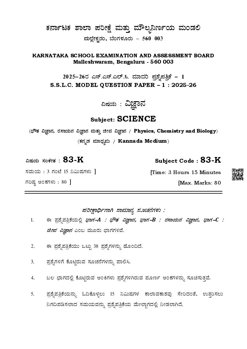 Karnataka SSLC Model Question Paper 2026 Science View Download