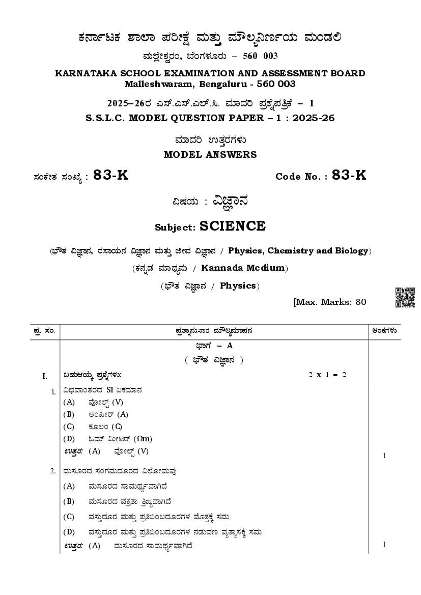 Karnataka SSLC Science Model Question Paper 2026