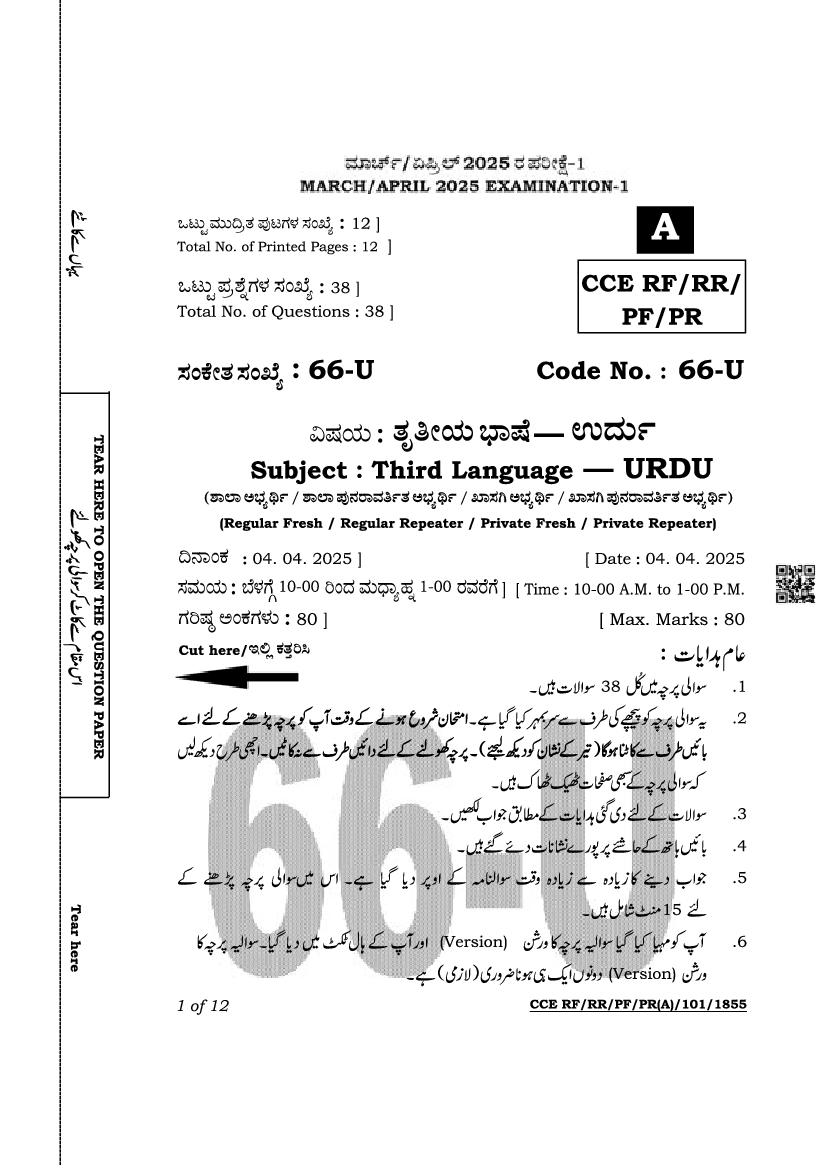 Karnataka SSLC Urdu Third Language Question Paper 2025 PDF Download Link – Click Here to Download Question Paper PDF