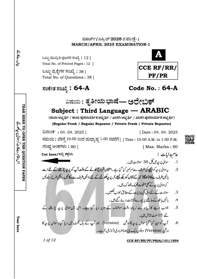 Karnataka SSLC Arabic Question Paper 2025 PDF