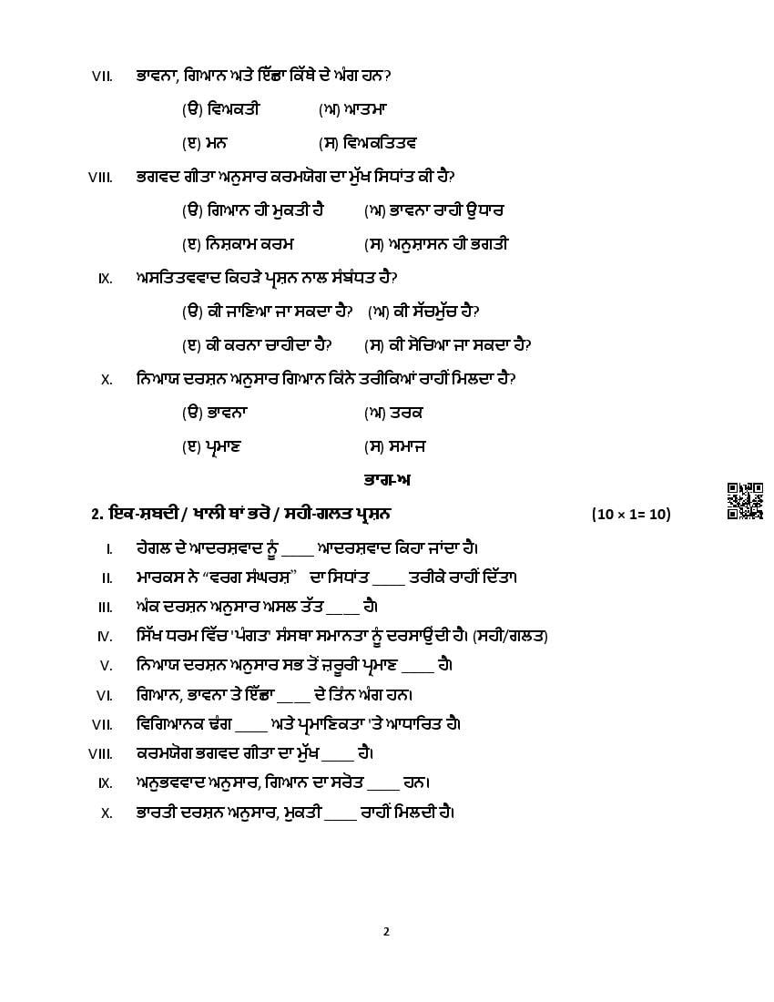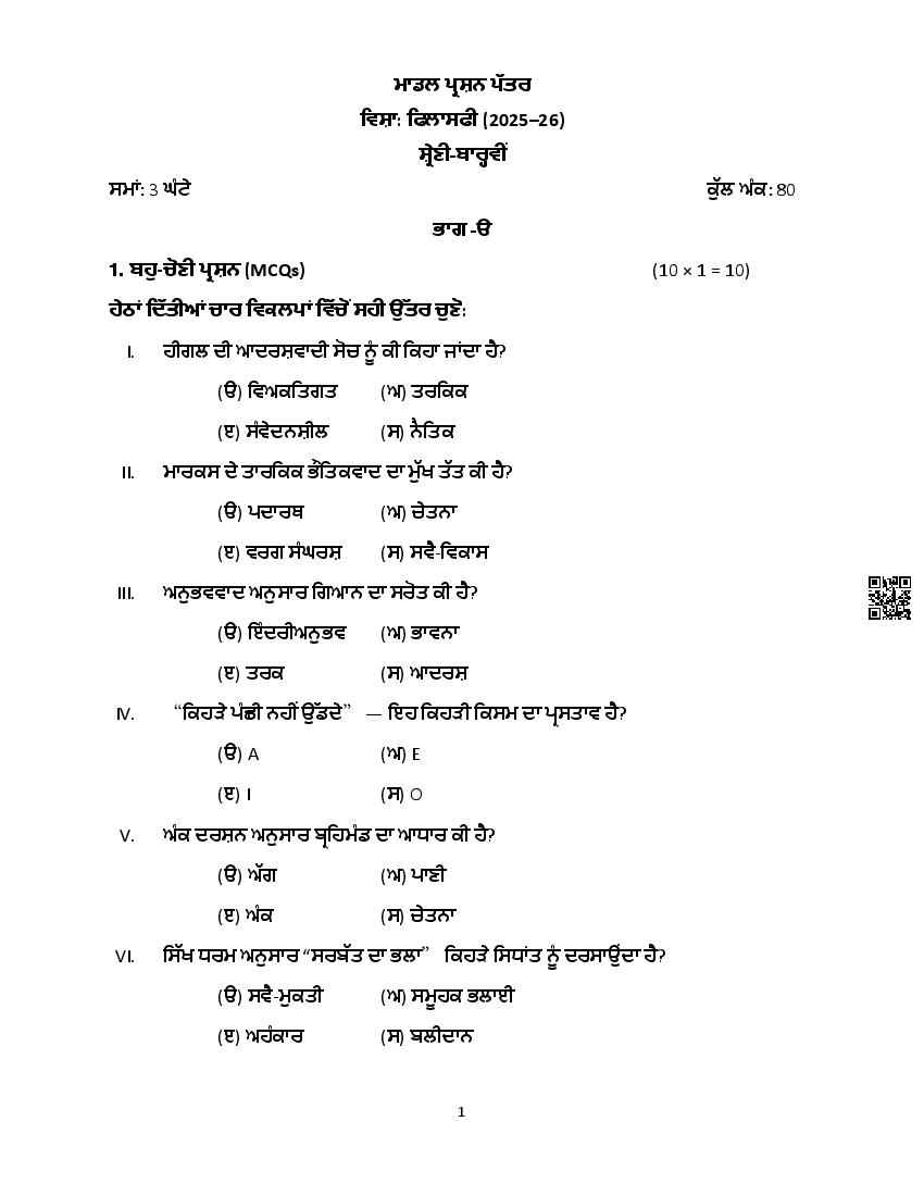 PSEB 12th Sample Paper 2026 Philosophy View Download