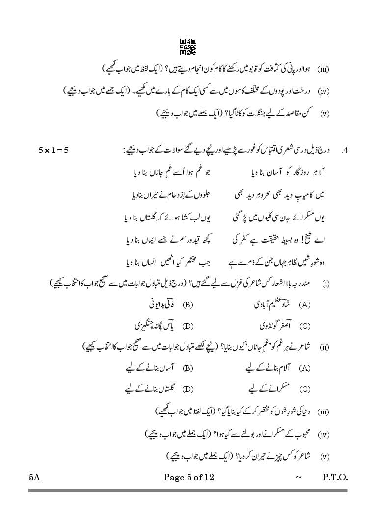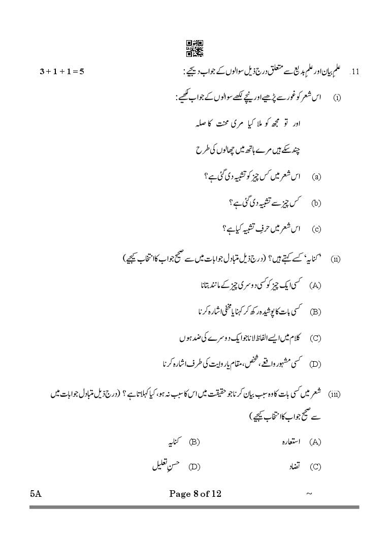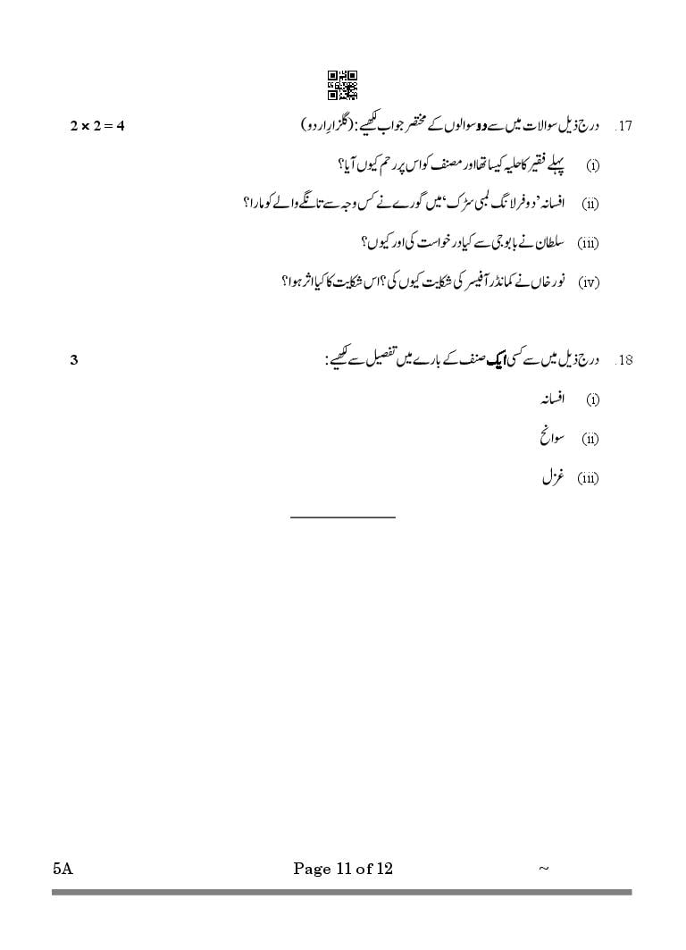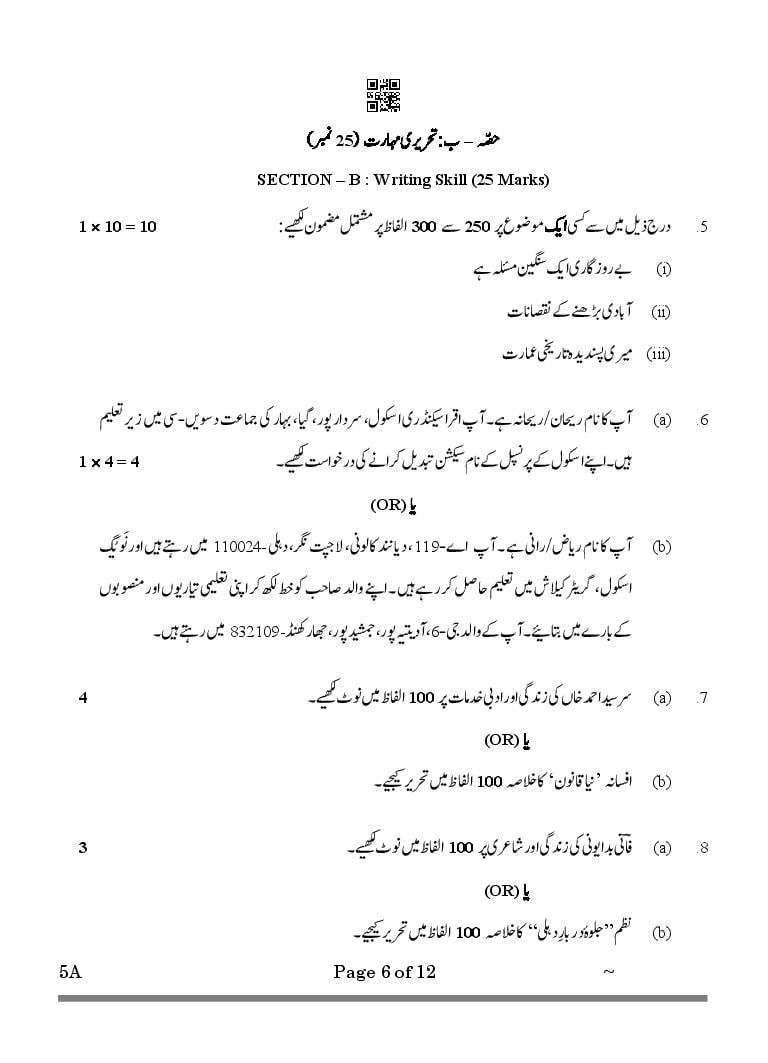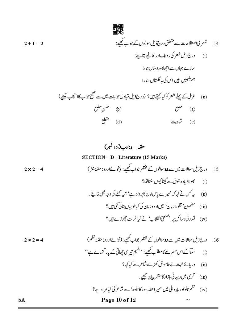 CBSE Class 10 Urdu A Question Paper 2026