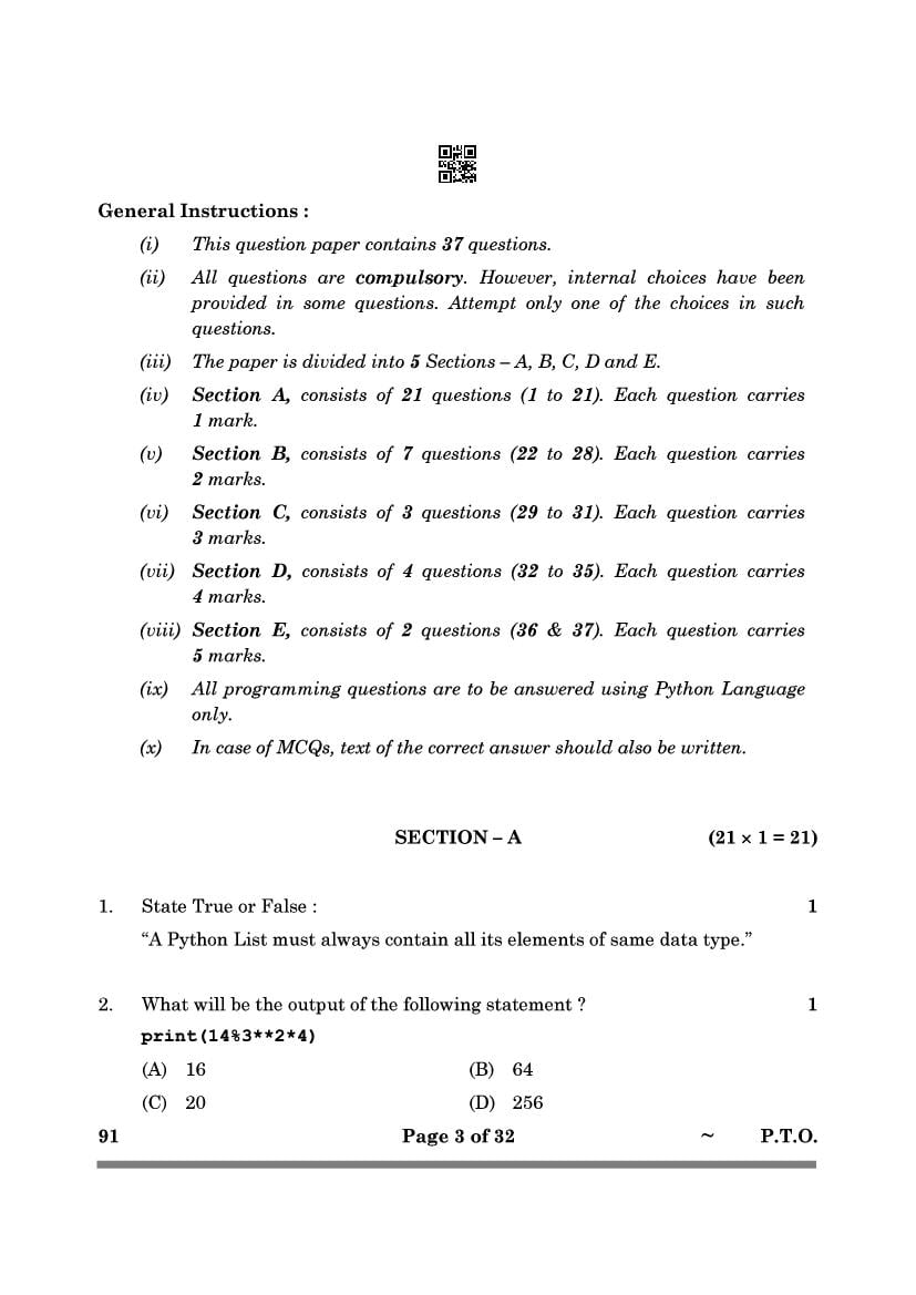 The CBSE question paper for class 12 Computer Science of the exam held in past years is as follows.