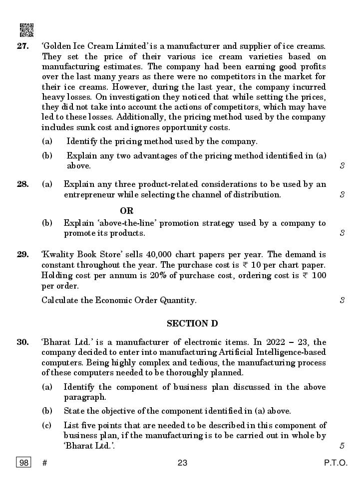 CBSE Class 12 Entrepreneurship Question Paper 2023 PDF Download Link – Click Here to Download Question Paper