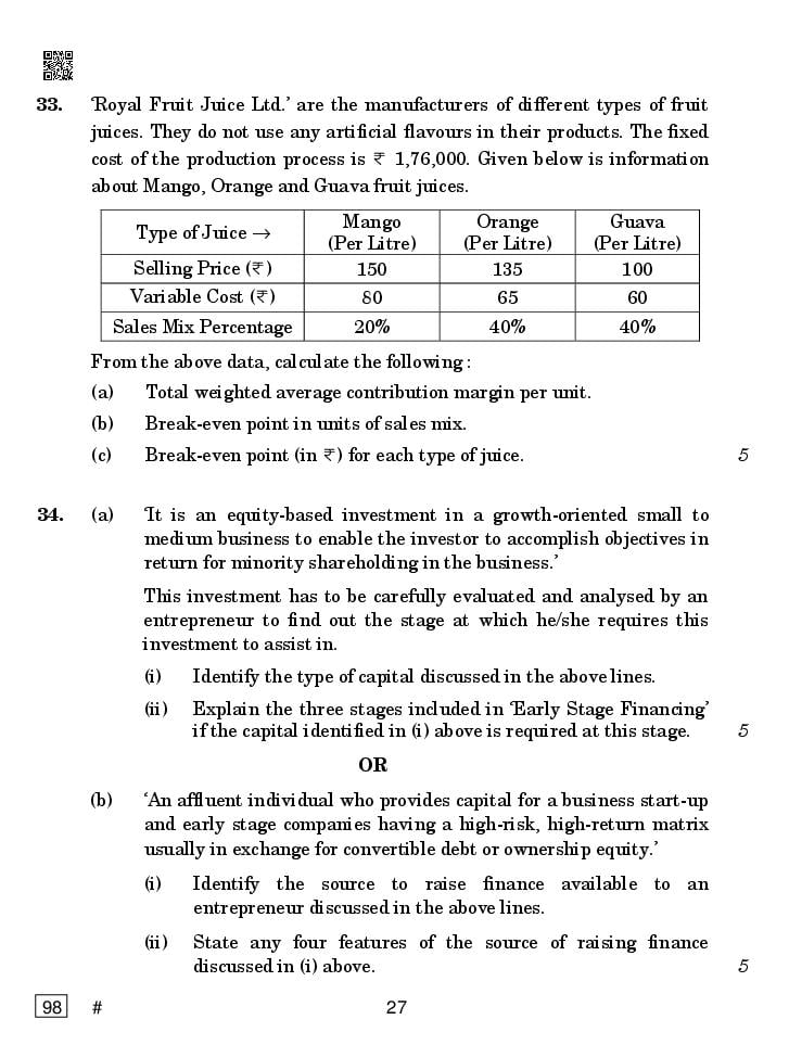 | 12 Exam | Entrepreneurship Question Paper | Entrepreneurship Answer Key |