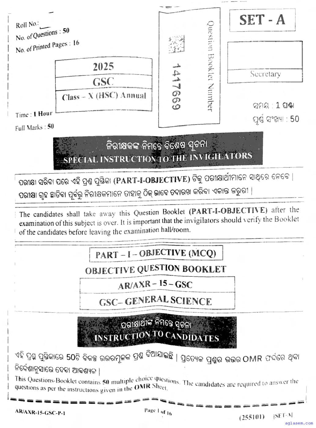 Odisha HSE Class 10 Science Question Paper 2026 has been published here at aglasem. You can now download the 10 Science Question Paper PDF to prepare for your exam. This Odisha 10 Question Paper contains actual questions asked in Science test in previous year class 10 exams. Therefore it is a very useful study material for Science subject which helps you score full marks in 10 exams.