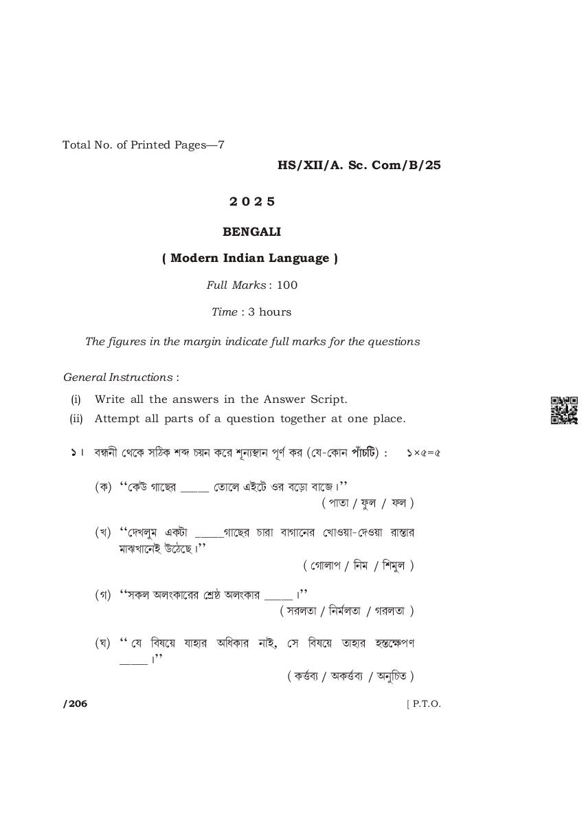 MBOSE Class 12 Question Paper 2025 for Bengali View Download