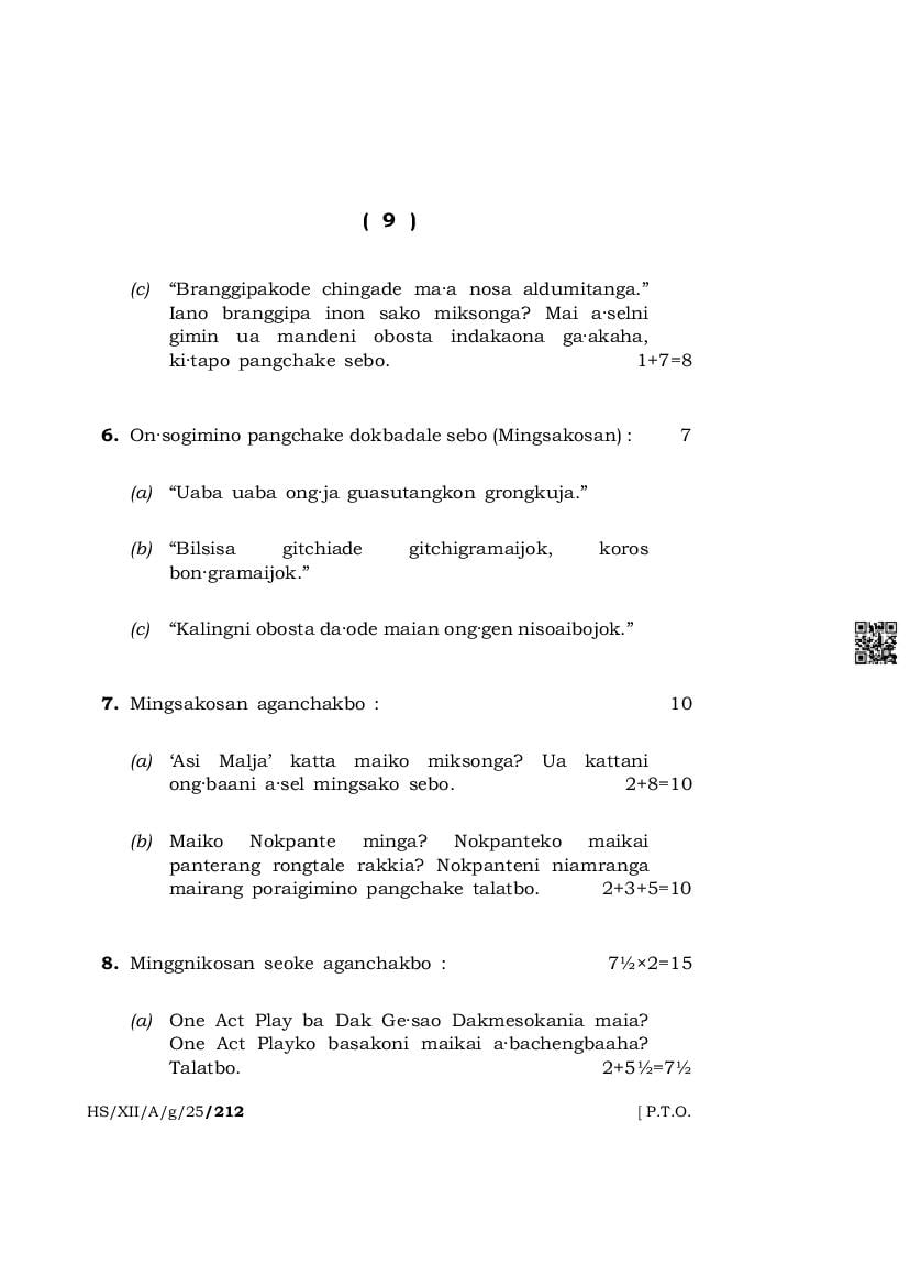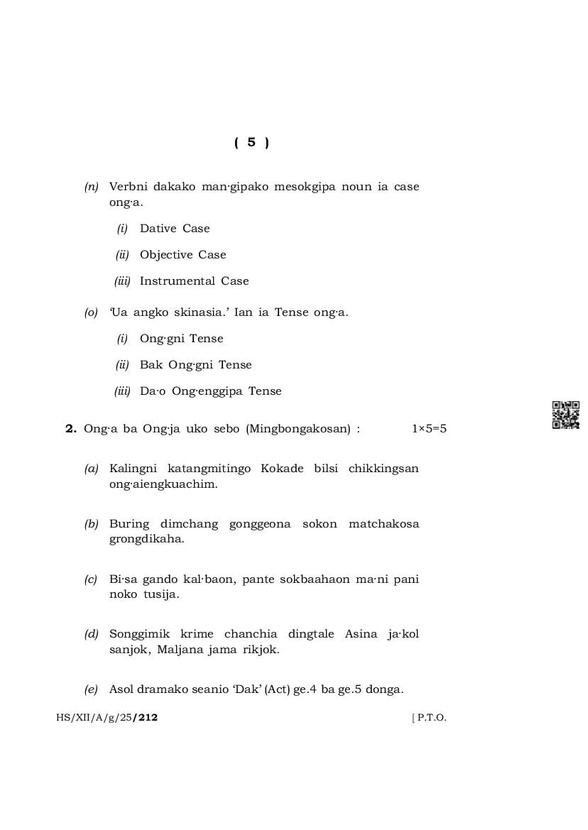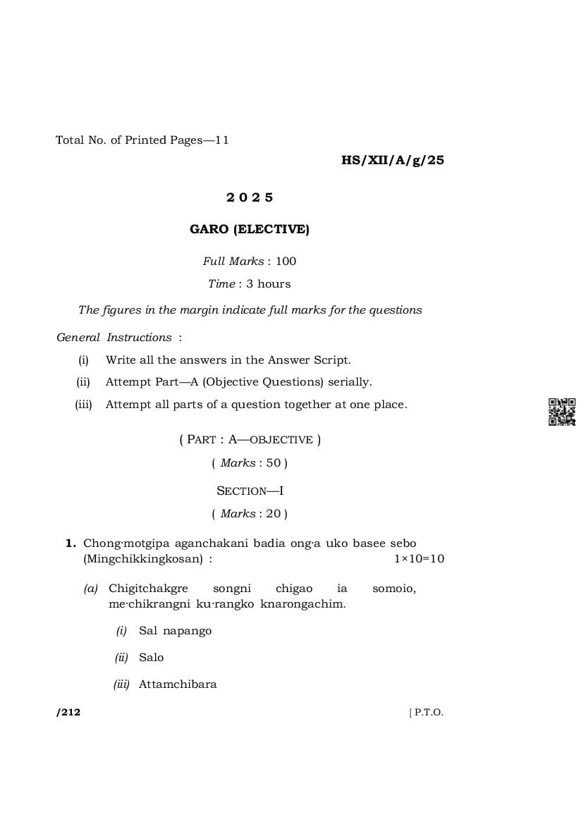 MBOSE Class 12 Question Paper 2025 for Garo Elective View Download