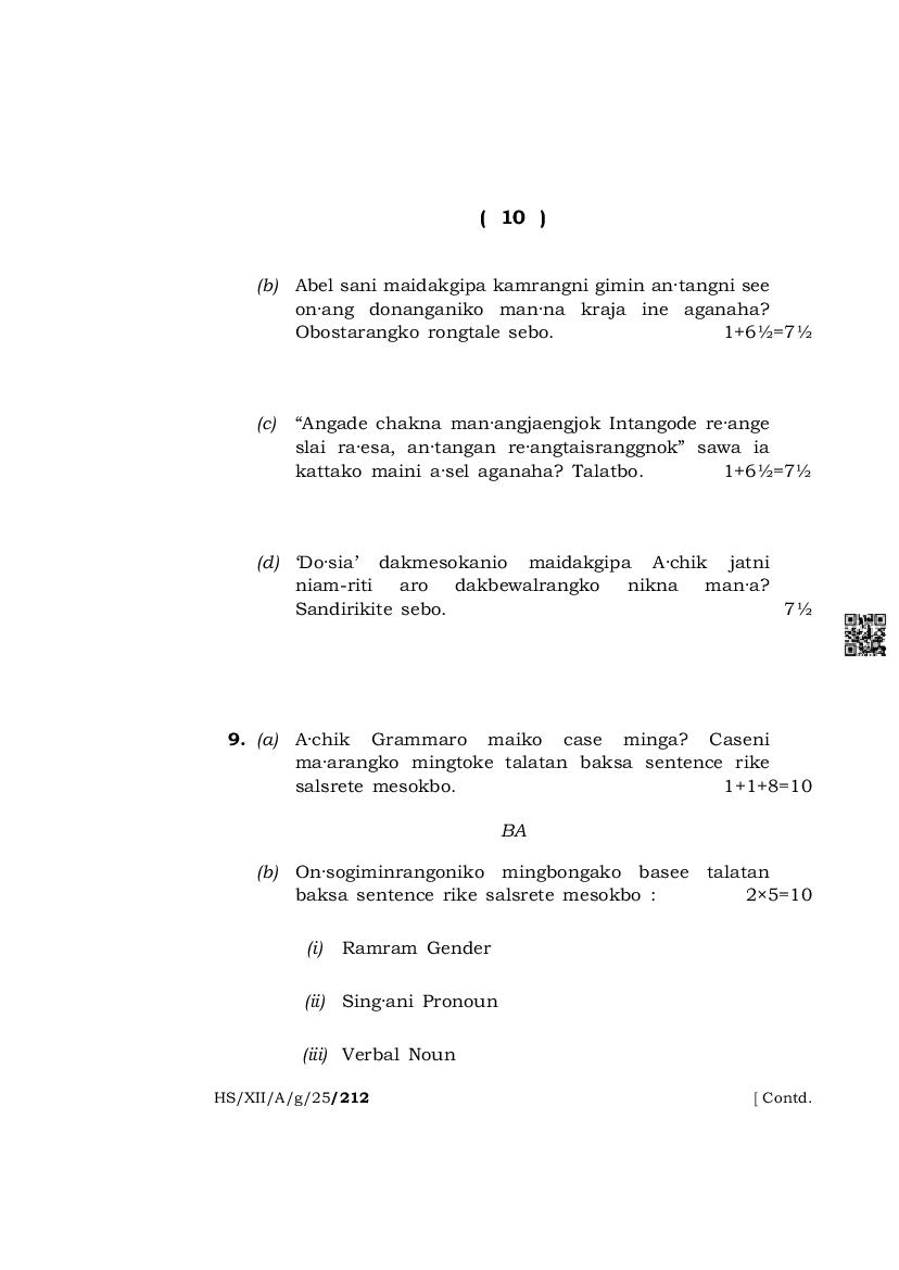 Meghalaya Board (MBOSE) Class 12 Question Paper 2025 for Gari Elective