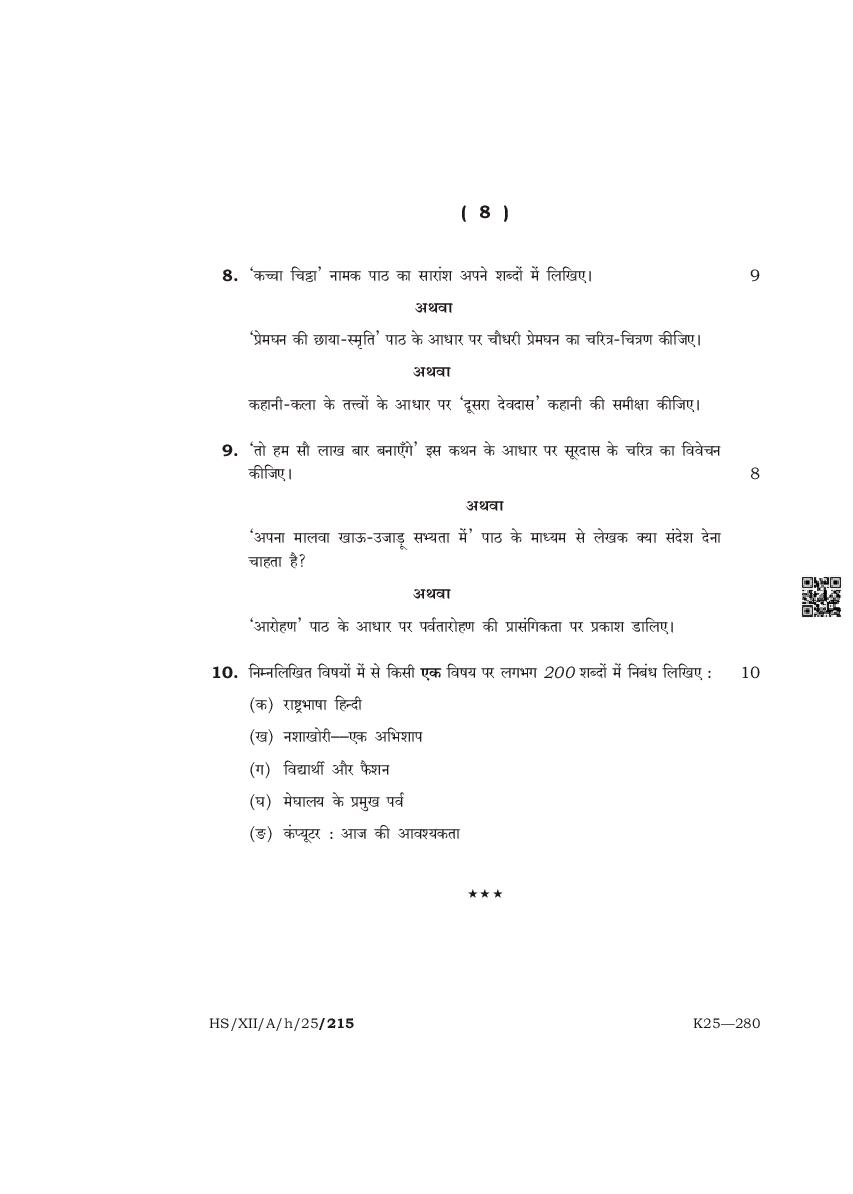 | Paper | Meghalaya Board Class 12 Question Paper of Hindi Elective |