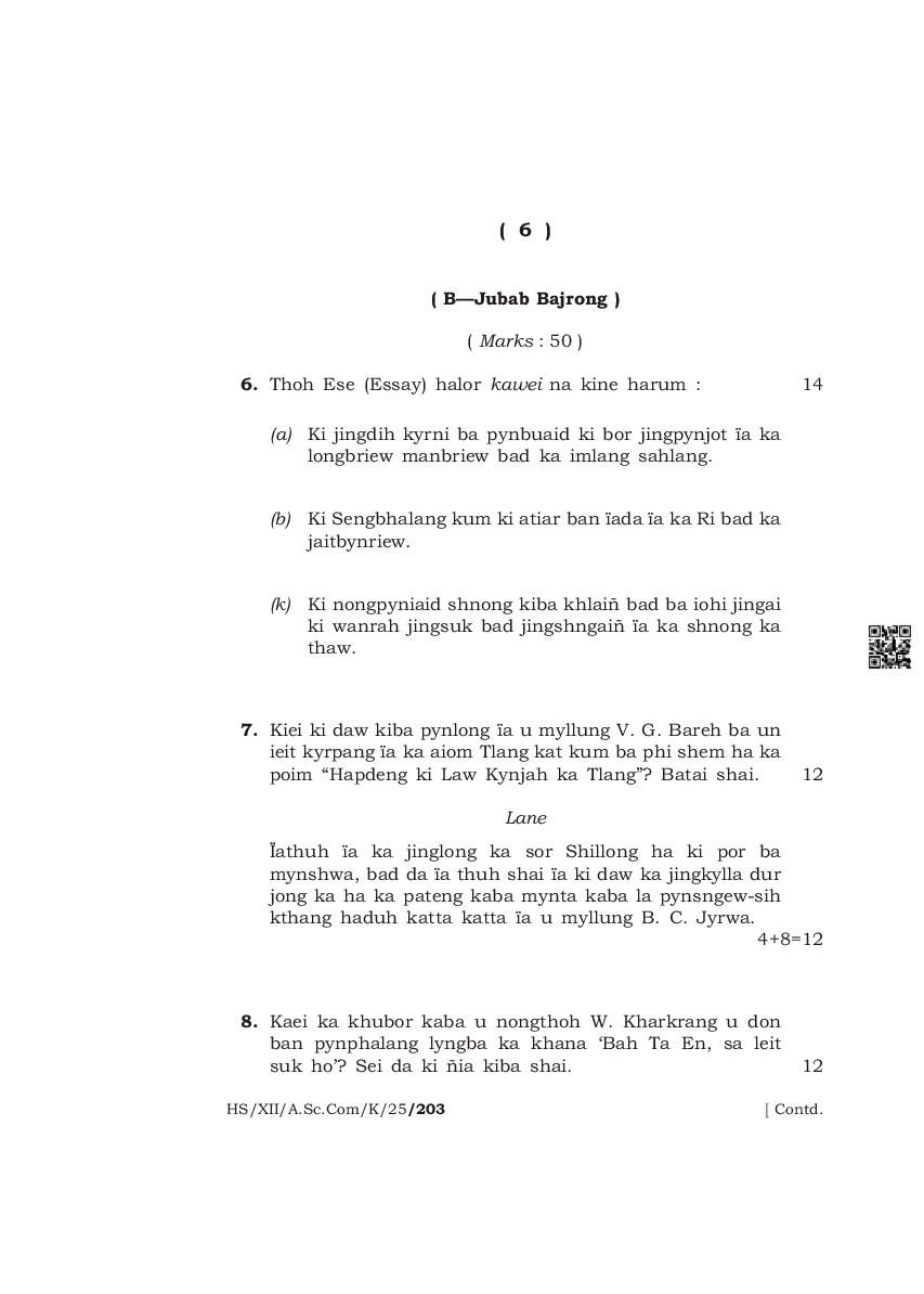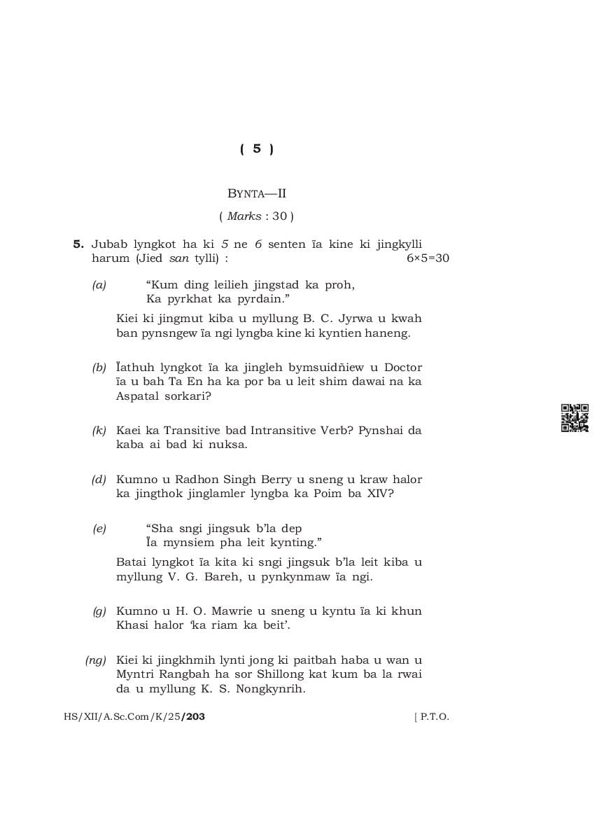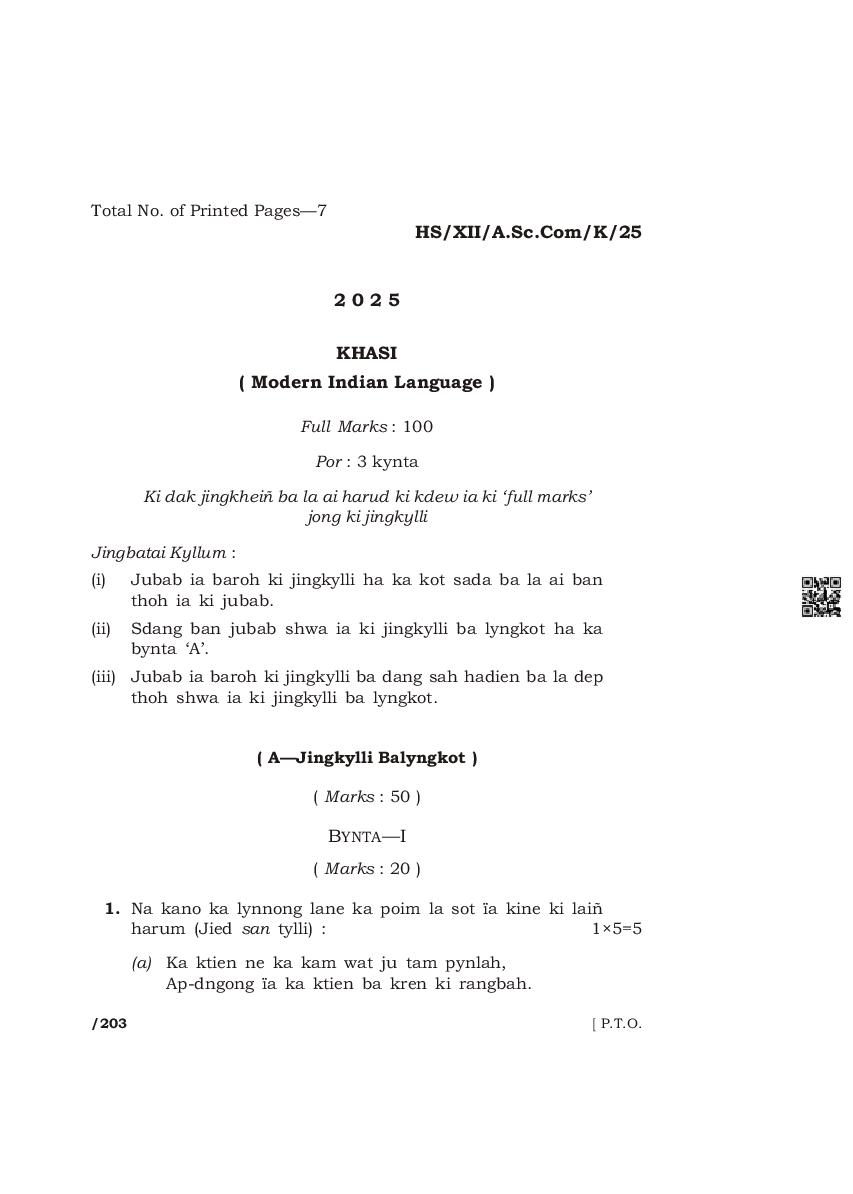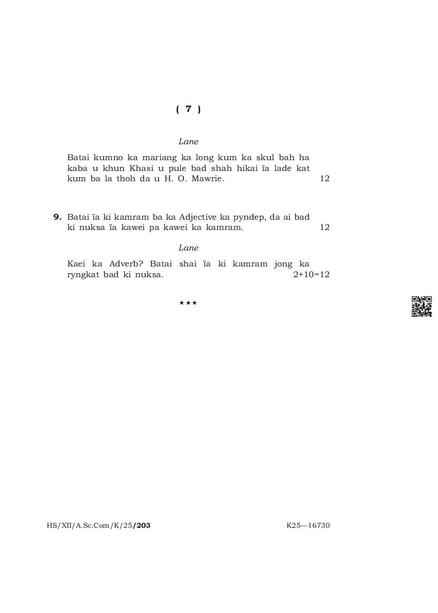 | Paper | Meghalaya Board Class 12 Question Paper of Khasi Mil |