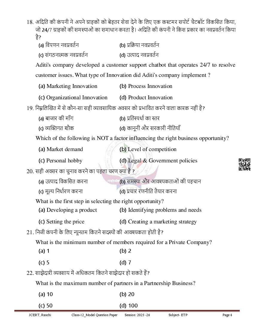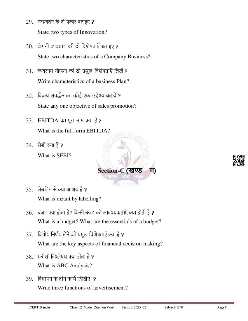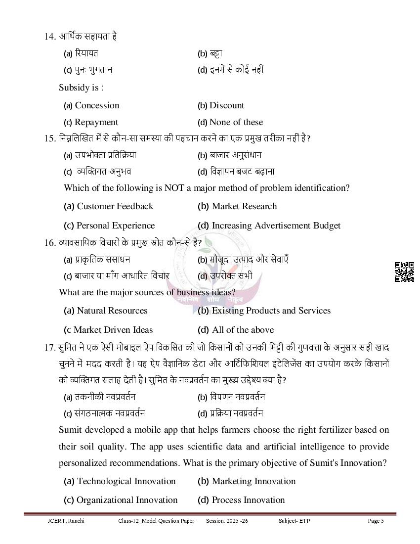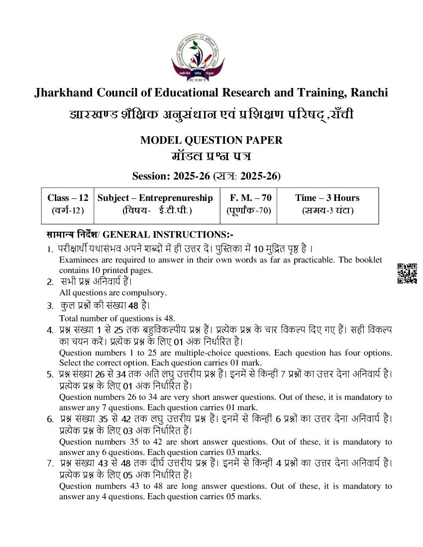 JAC Class 12 Model Question Paper 2026 Entreprenureship View Download