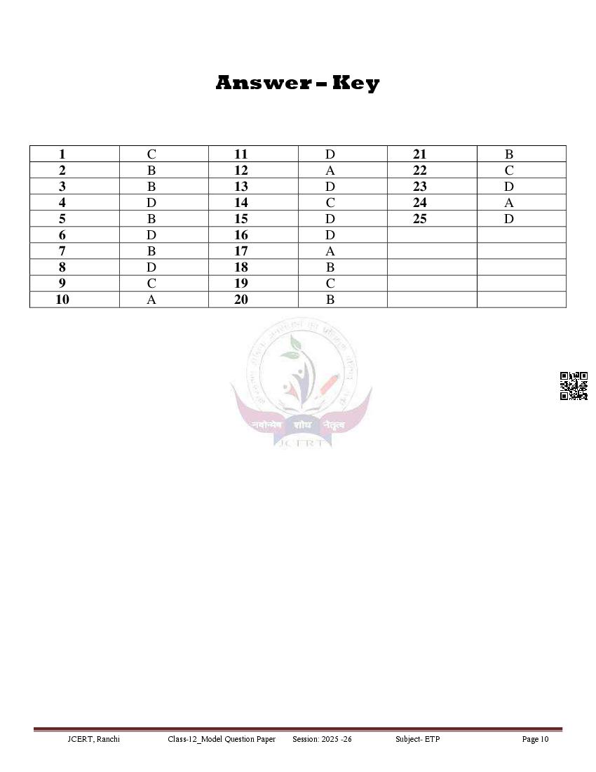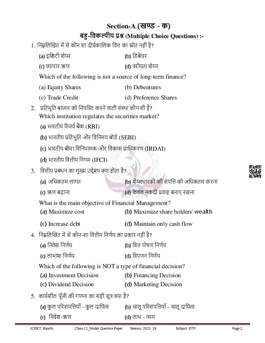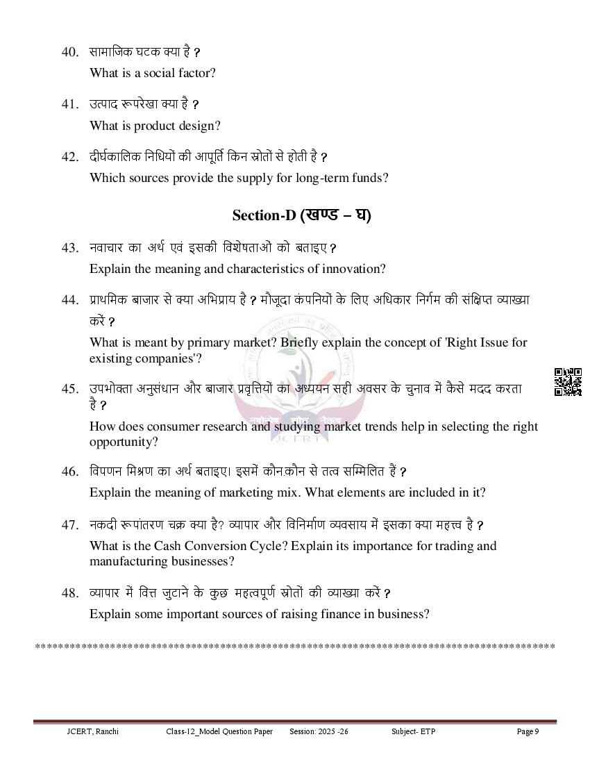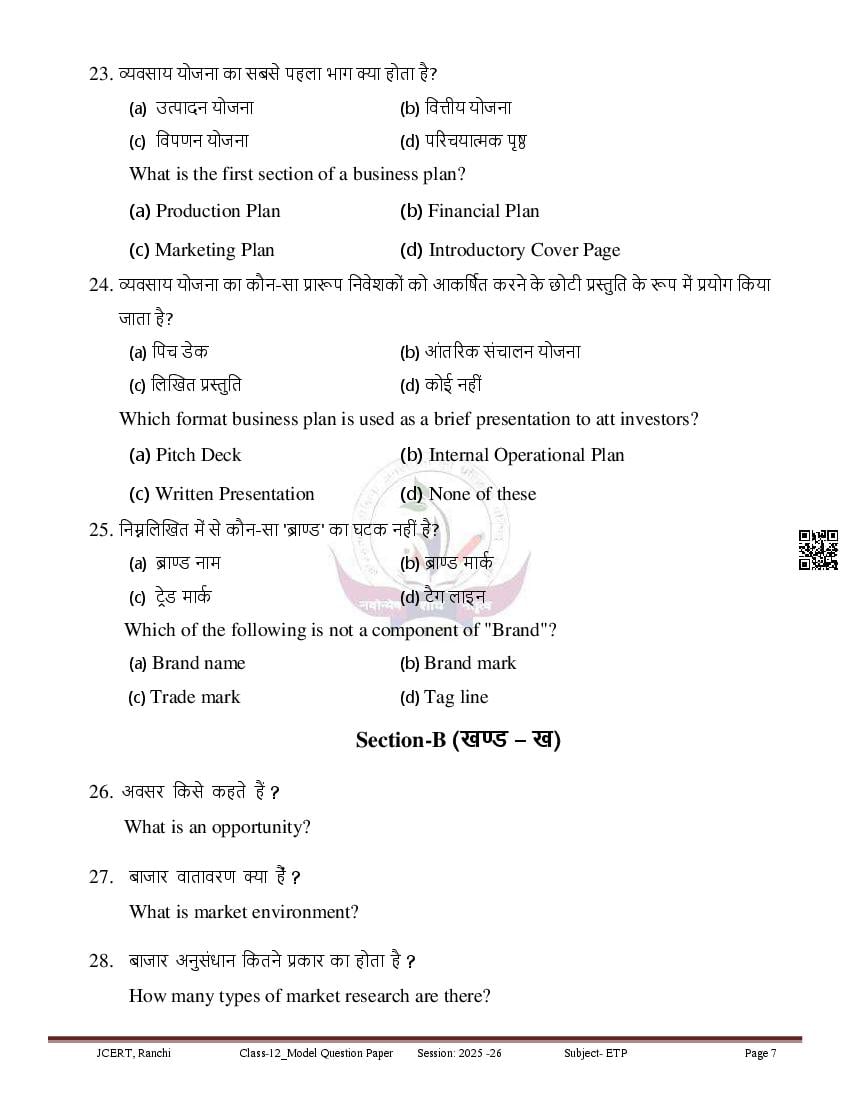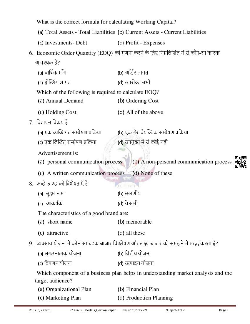 JAC Class 12 Model Question Paper 2026 Entreprenureship View Download