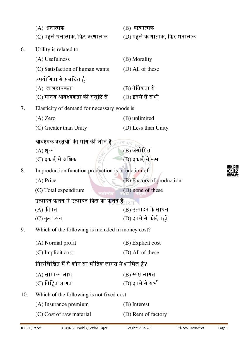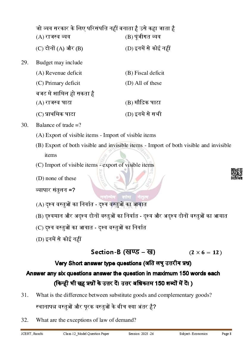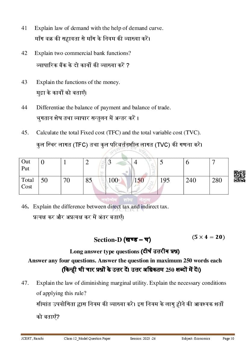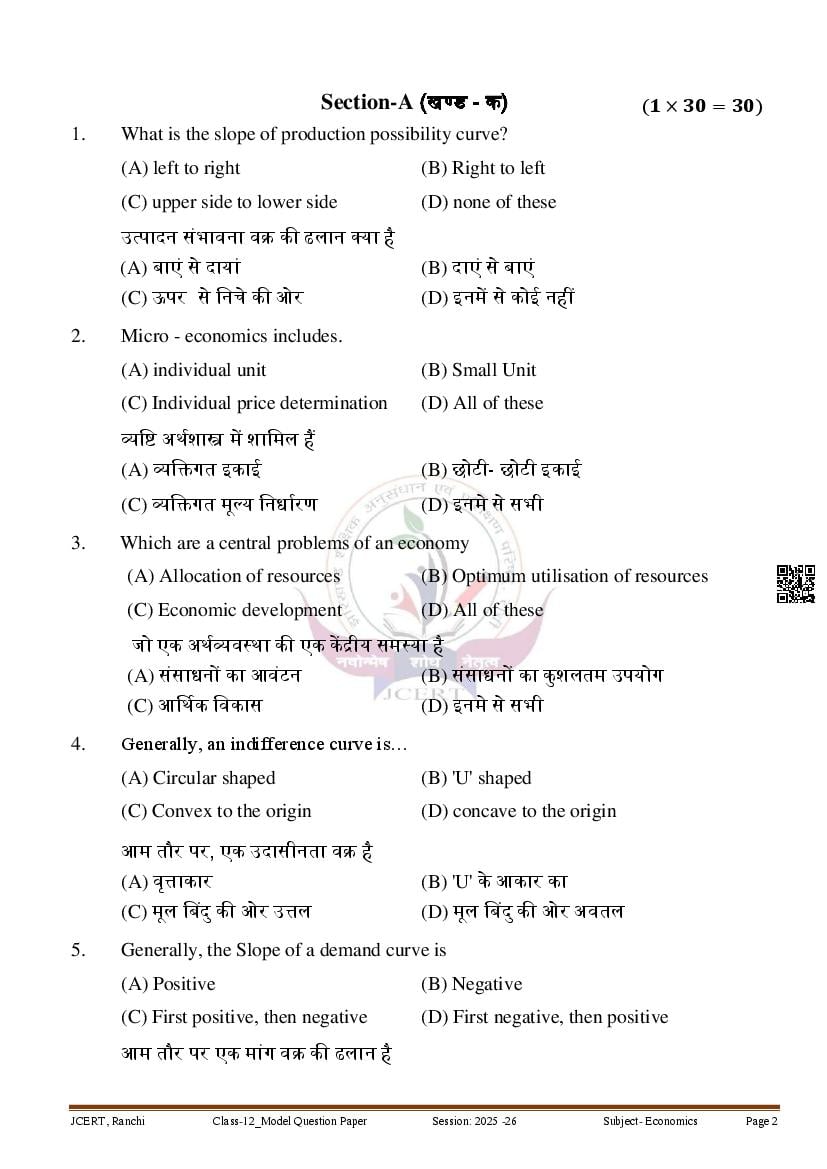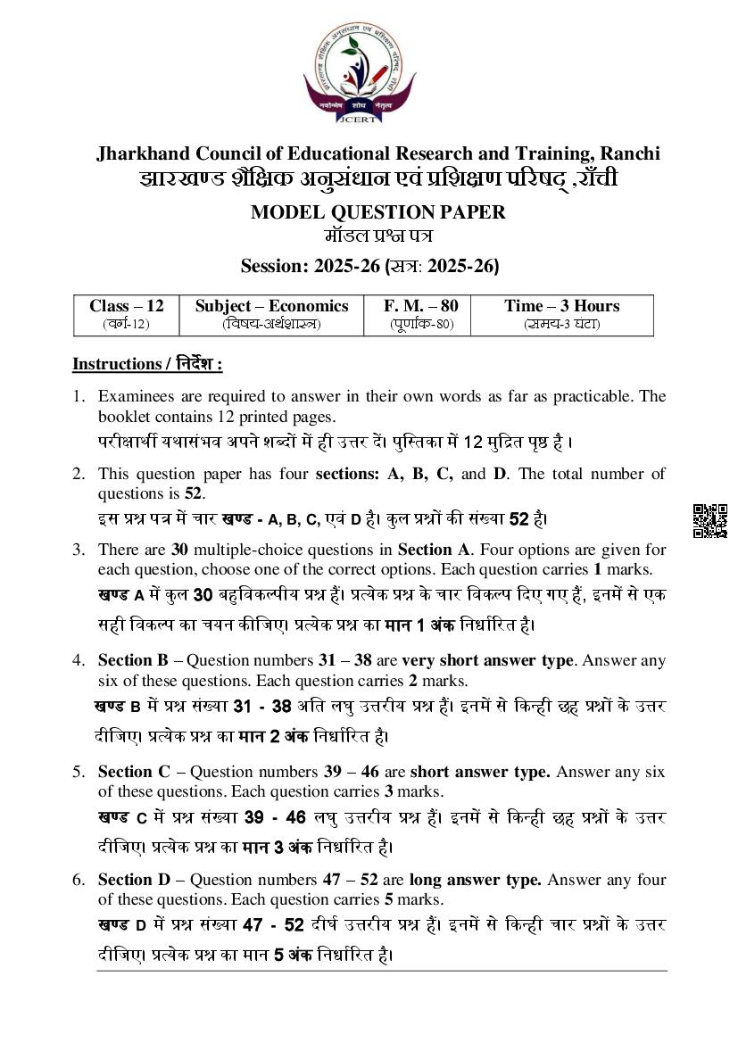 JAC Class 12 Model Question Paper 2026 Economics View Download