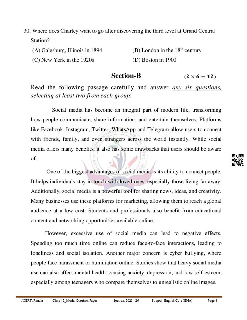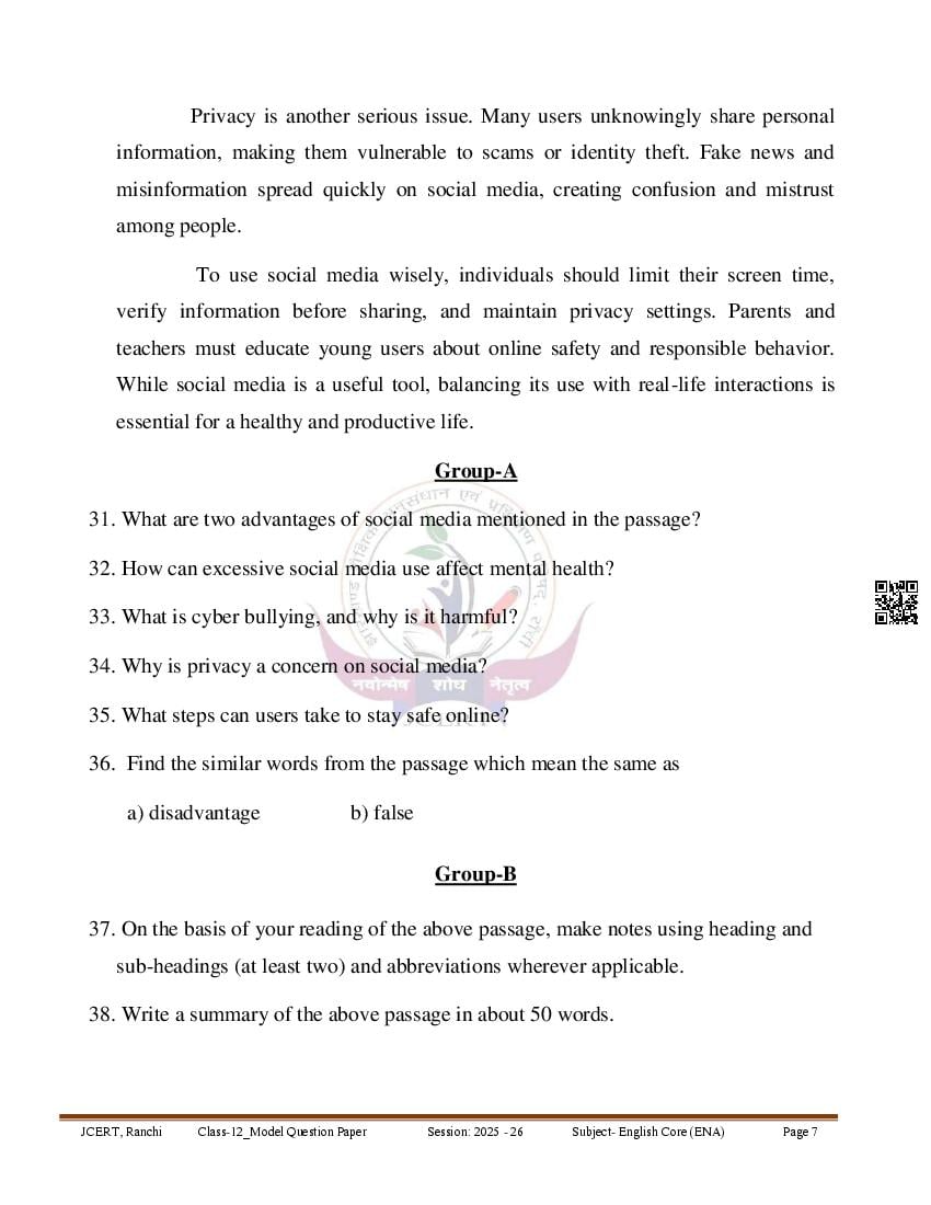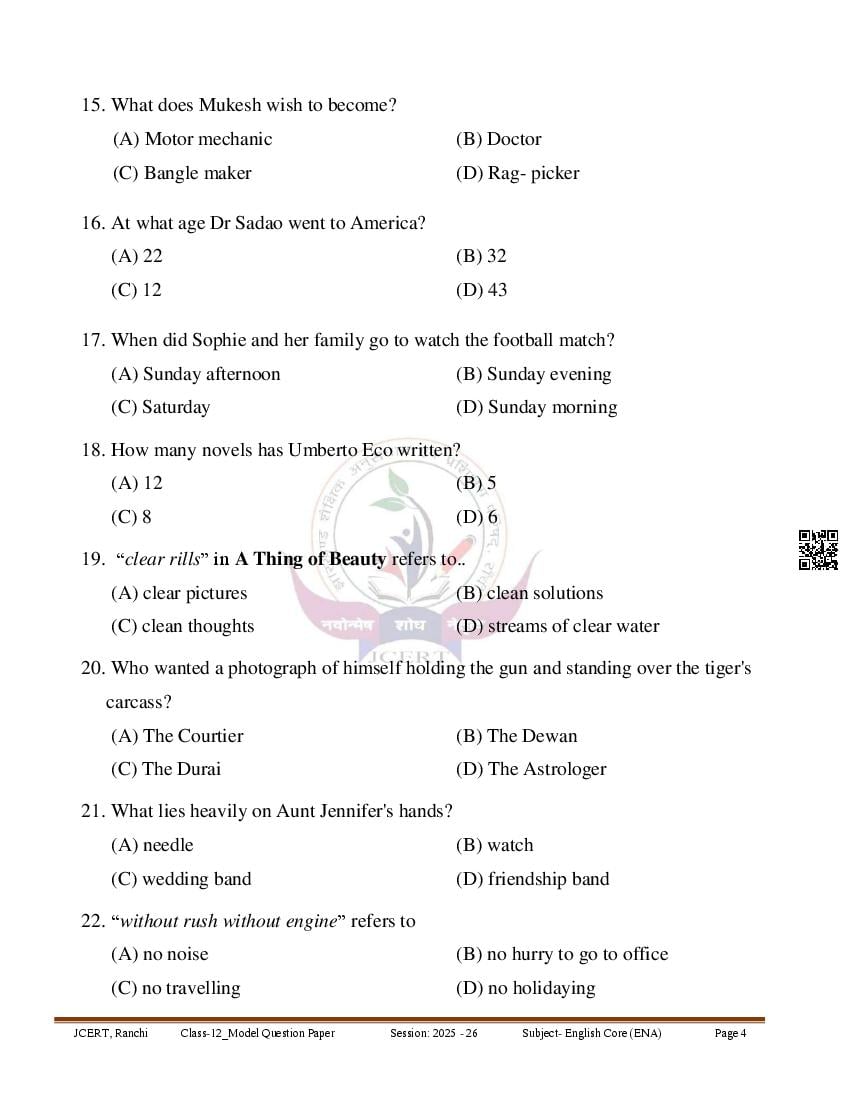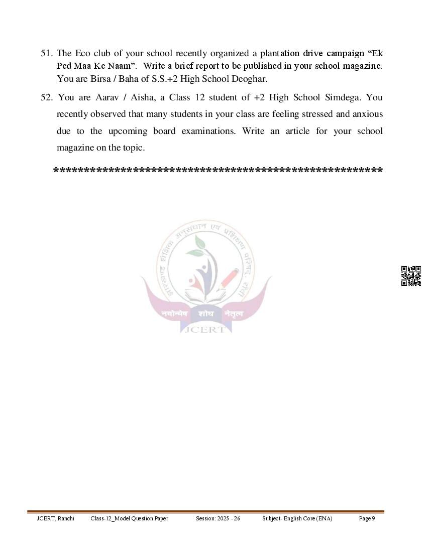 | Study Material Here | Jharkhand Board Class 12 Model Paper for English |