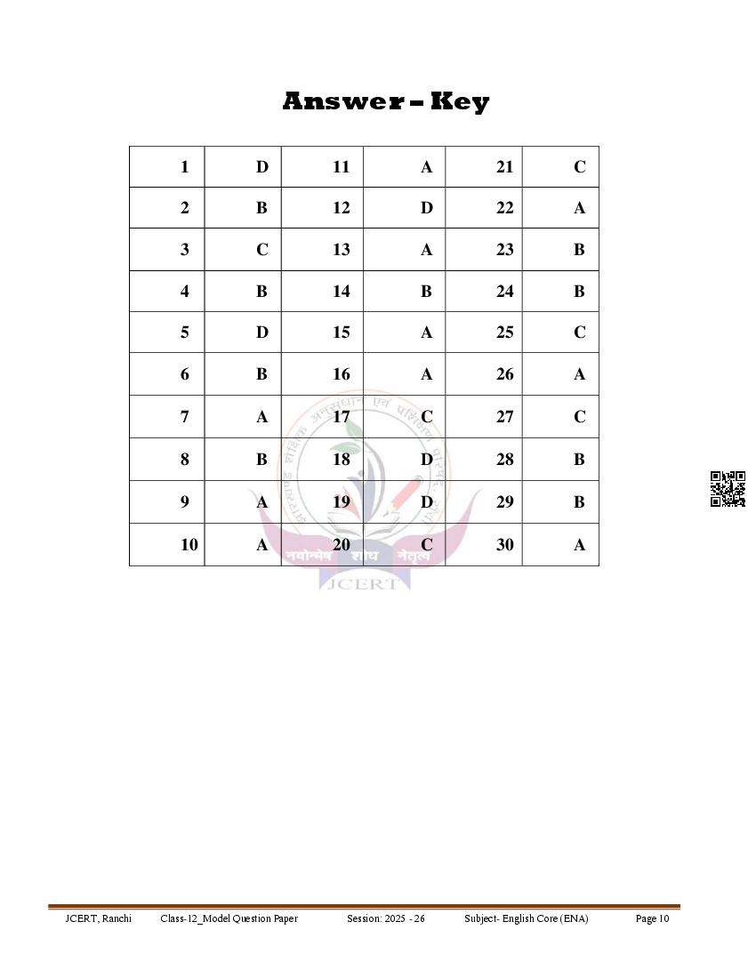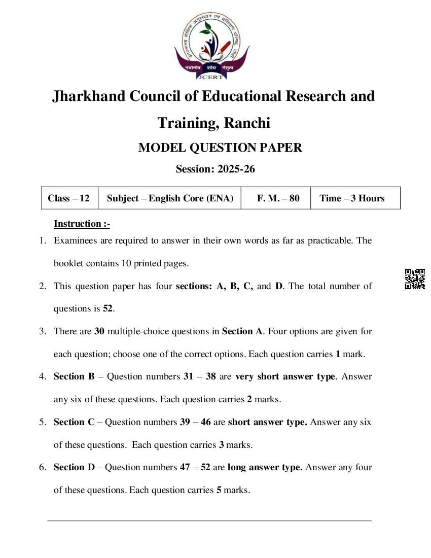 JAC Class 12 Model Question Paper 2026 English Core View Download