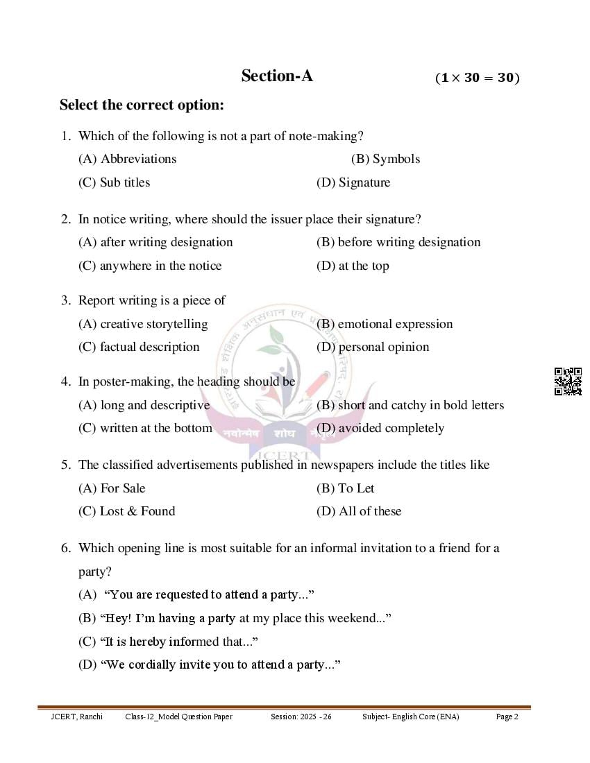 JAC 12th English Model Question Paper 2026