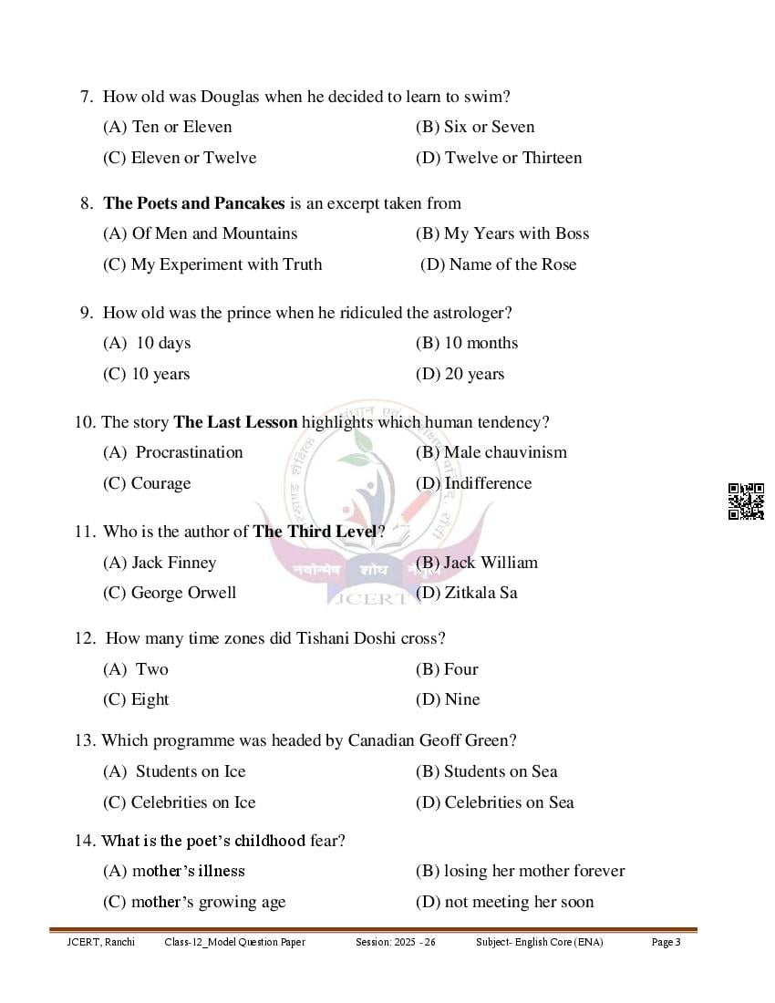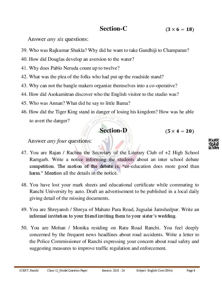 JAC 12th English Model Question Paper 2026 PDF