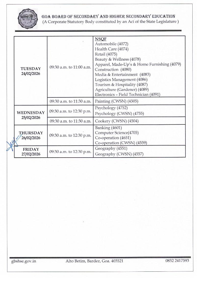 - Goa HSSC Time Table