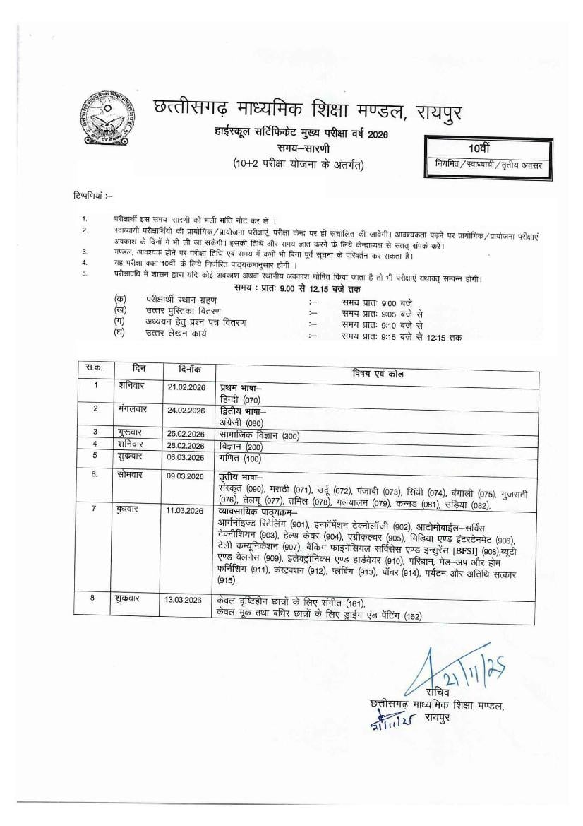 Latest: – CG Board 10th Time Table 2026 has been released. Scroll down to check the complete time table.