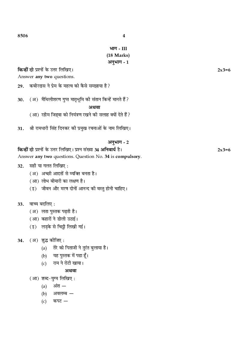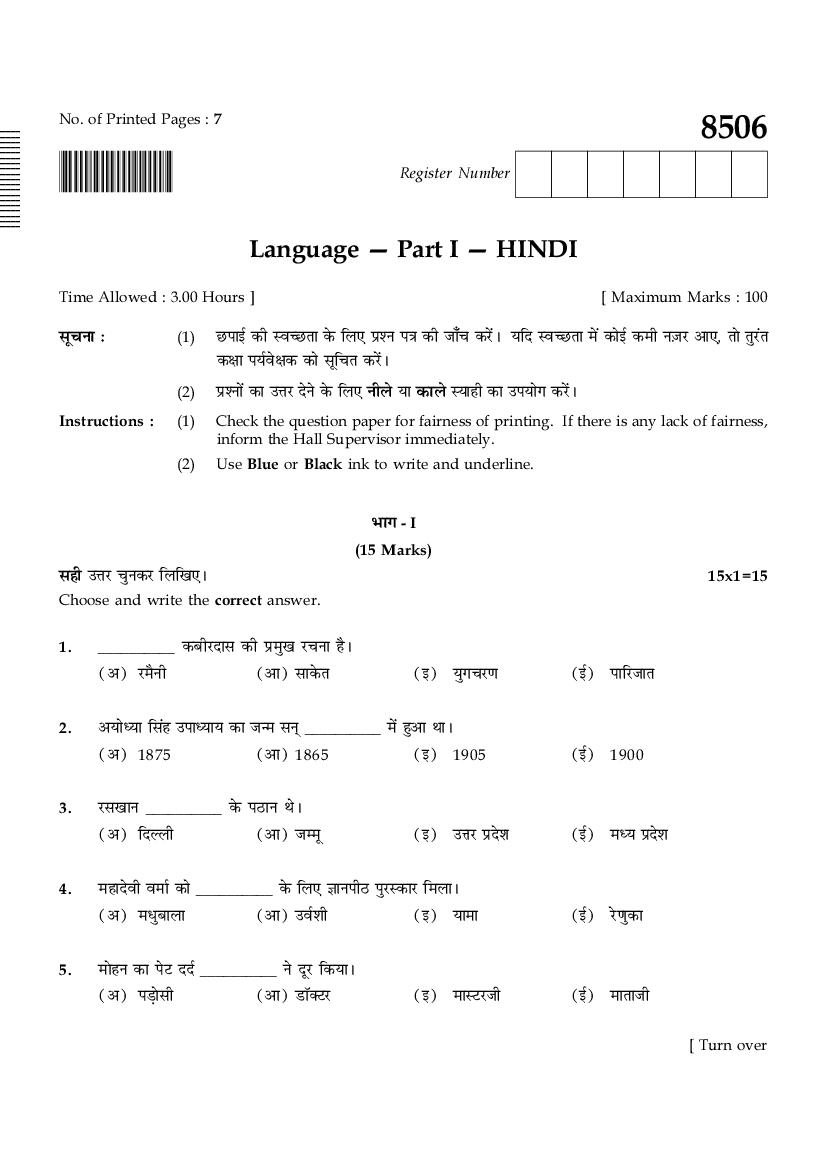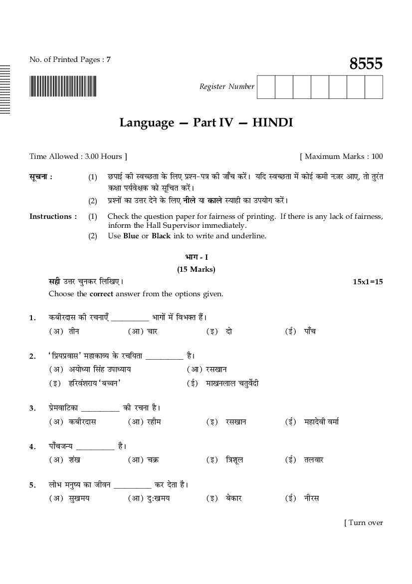 The TN Board Previous Year Question Paper for SSLC (Class 10) Hindi is as follows.