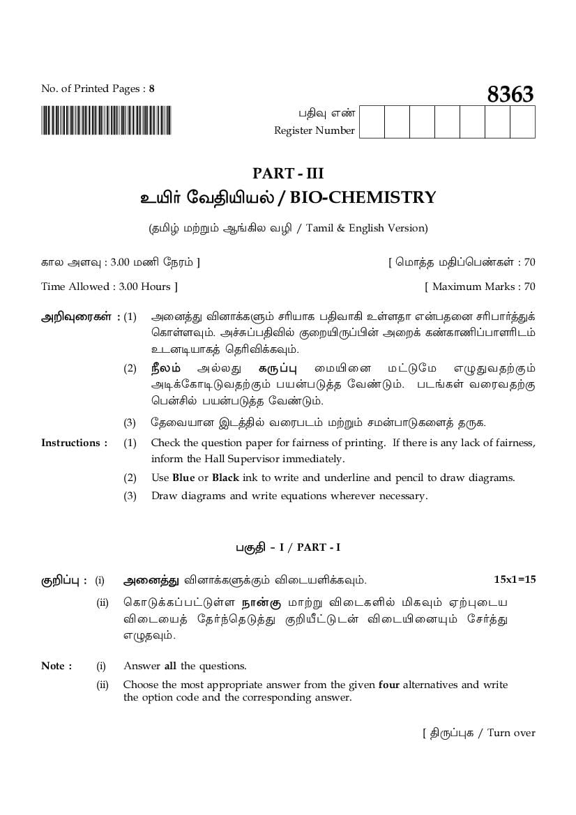 TN 12th Public Exam Bio Chemistry Question Paper 2024 PDF Download Link – Click Here to Download 2024 Question Paper
