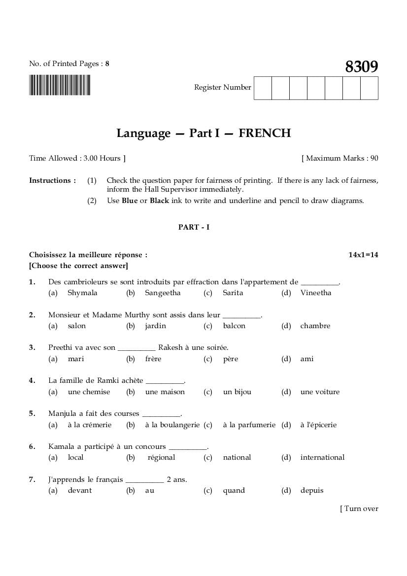 TN 12th Public Exam French Question Paper 2024 PDF Download Link – Click Here to Download 2024 Question Paper