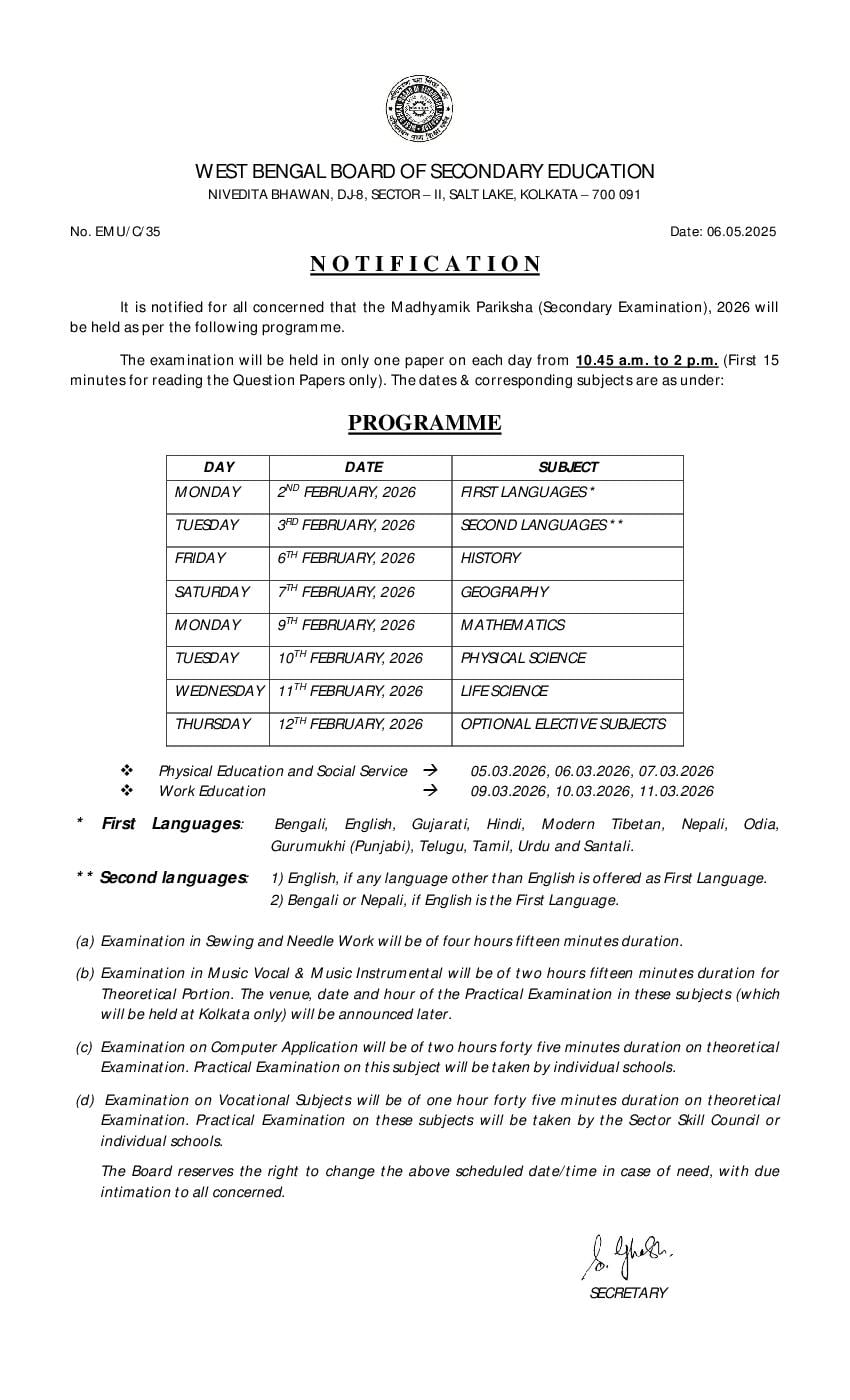 Latest: – West Bengal Madhyamik Routine 2026 has been released. Scroll down to check the complete time table.