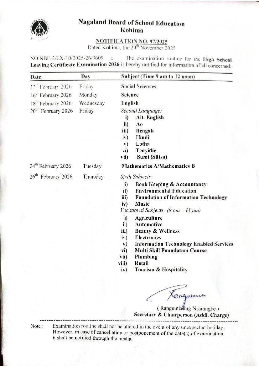 NBSE HSLC Routine 2025-26 (Out) | Check Nagaland Board Class 10th Exam Date