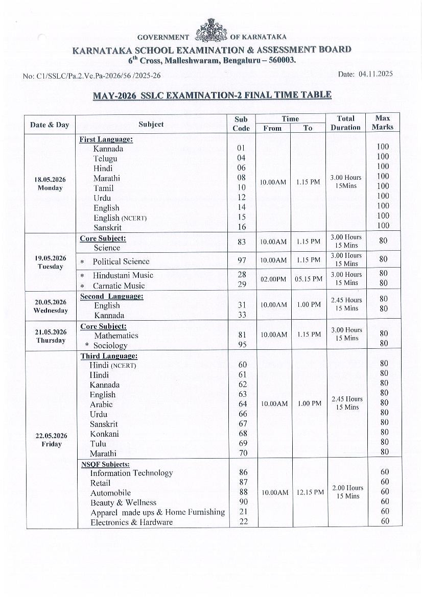 Latest: – Karnataka SSLC Time Table 2026 has been released. Scroll down to check the complete time table.