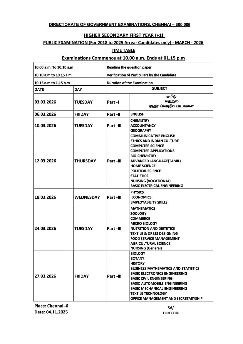 Tamil Nadu 11th Time Table 2026 PDF Download – Download the DGE TN Class 11 Exam Date.