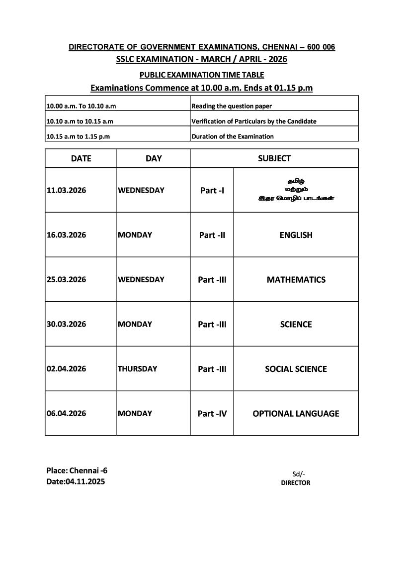 Tamil Nadu 10th Public Exam Time Table 2026