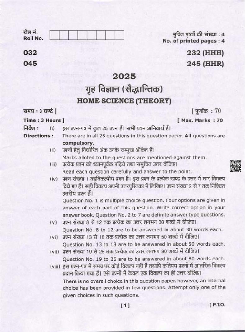 Uttarakhand Board Class 10 Home Science Question Paper 2025