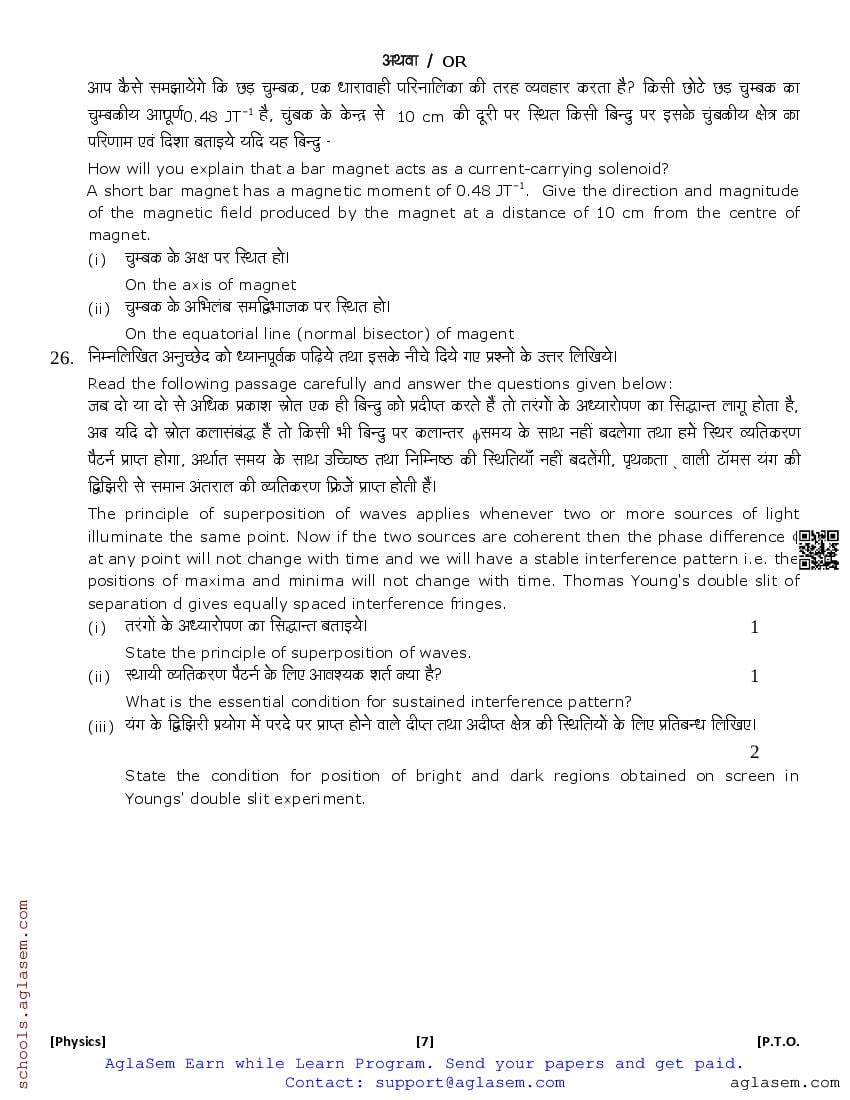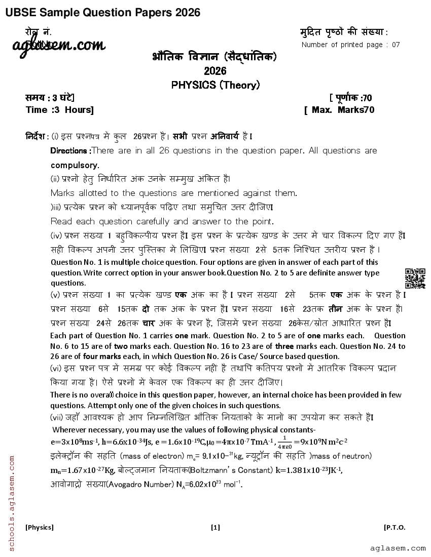Uttarakhand Board Class 12th Physics Sample Paper 2026 has been released by UBSE. Therefore you can now download the UK Board 12th Model Paper for Physics PDF from here on aglasem. This UK Board class 12 model paper contains sample questions for Physics based on the latest syllabus. Moreover the class 12 sample paper has Physics questions in the same pattern as you will get in UK Board 12th Physics exam that will be held by Uttarakhand Board of School Education. Therefore solving this Physics model question paper increases your chances of getting 100% in UK Board exam.
