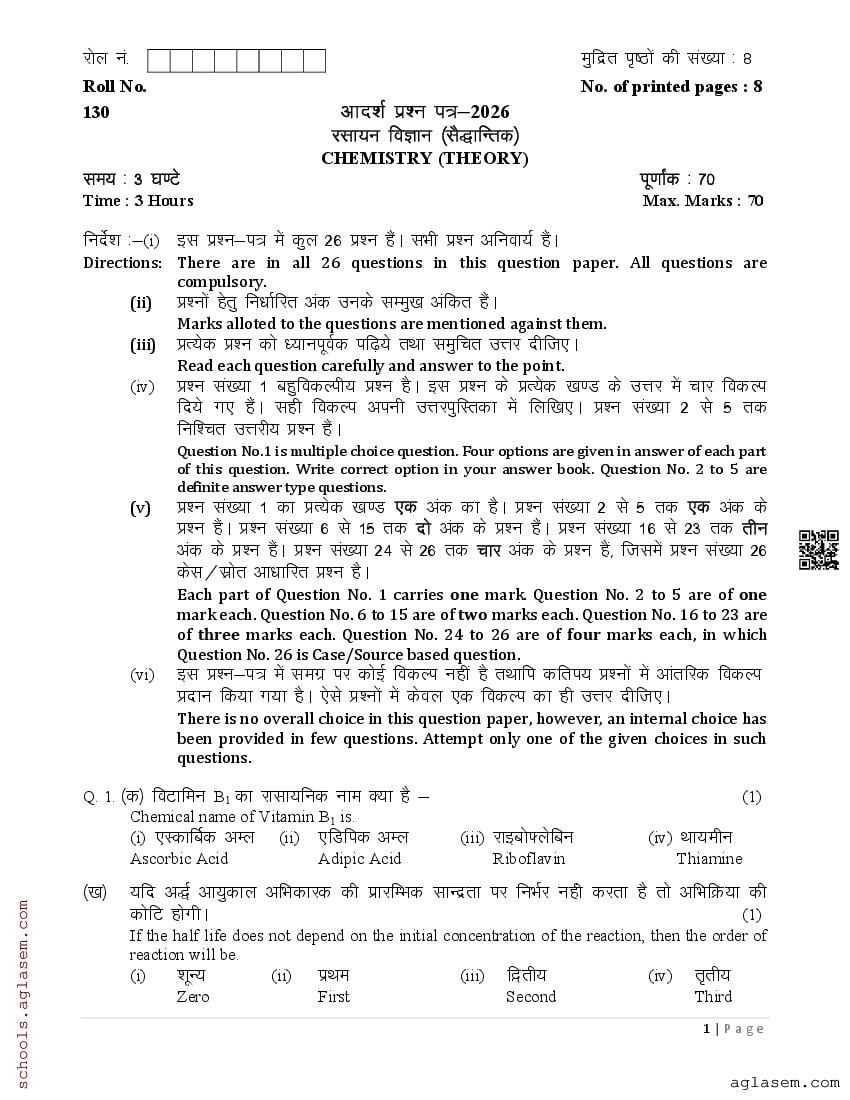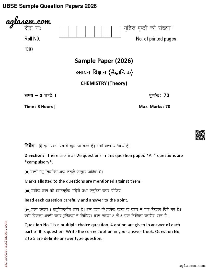 Uttarakhand Board Class 12th Chemistry Sample Paper 2026 has been released by UBSE. Therefore you can now download the UK Board 12th Model Paper for Chemistry PDF from here on aglasem. This UK Board class 12 model paper contains sample questions for Chemistry based on the latest syllabus. Moreover the class 12 sample paper has Chemistry questions in the same pattern as you will get in UK Board 12th Chemistry exam that will be held by Uttarakhand Board of School Education. Therefore solving this Chemistry model question paper increases your chances of getting 100% in UK Board exam.