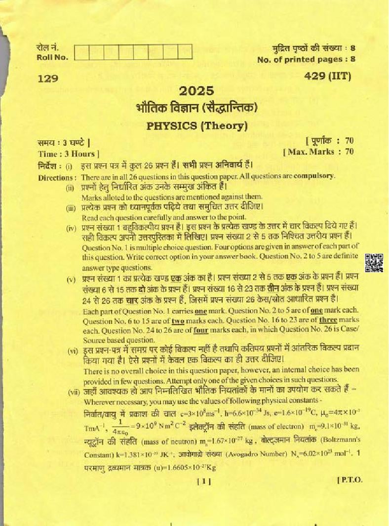 Uttarakhand Board Class 12 Question Paper 2025 For Physics View Download