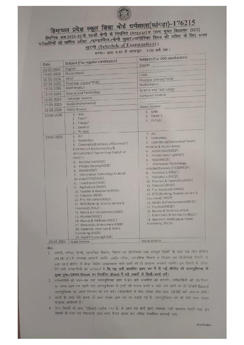 | Time Table Here | HPBOSE SOS Matric 10th Date Sheet |