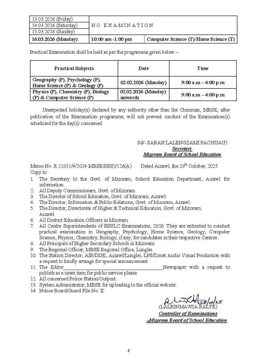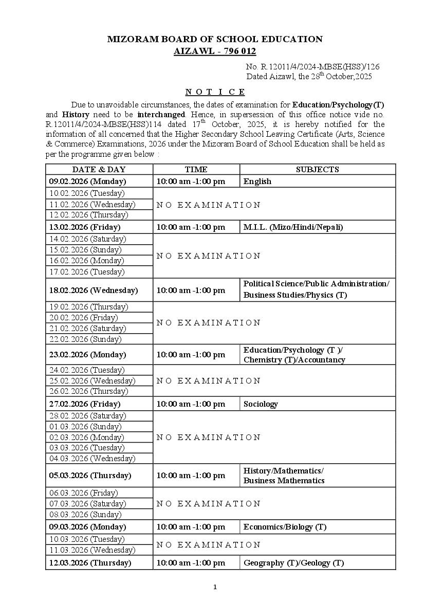 The exam date sheet of Mizoram Board for Class 12 exams are as follows.