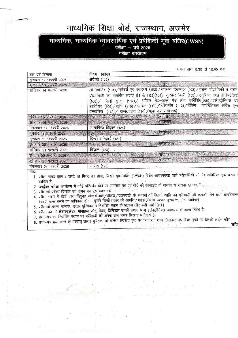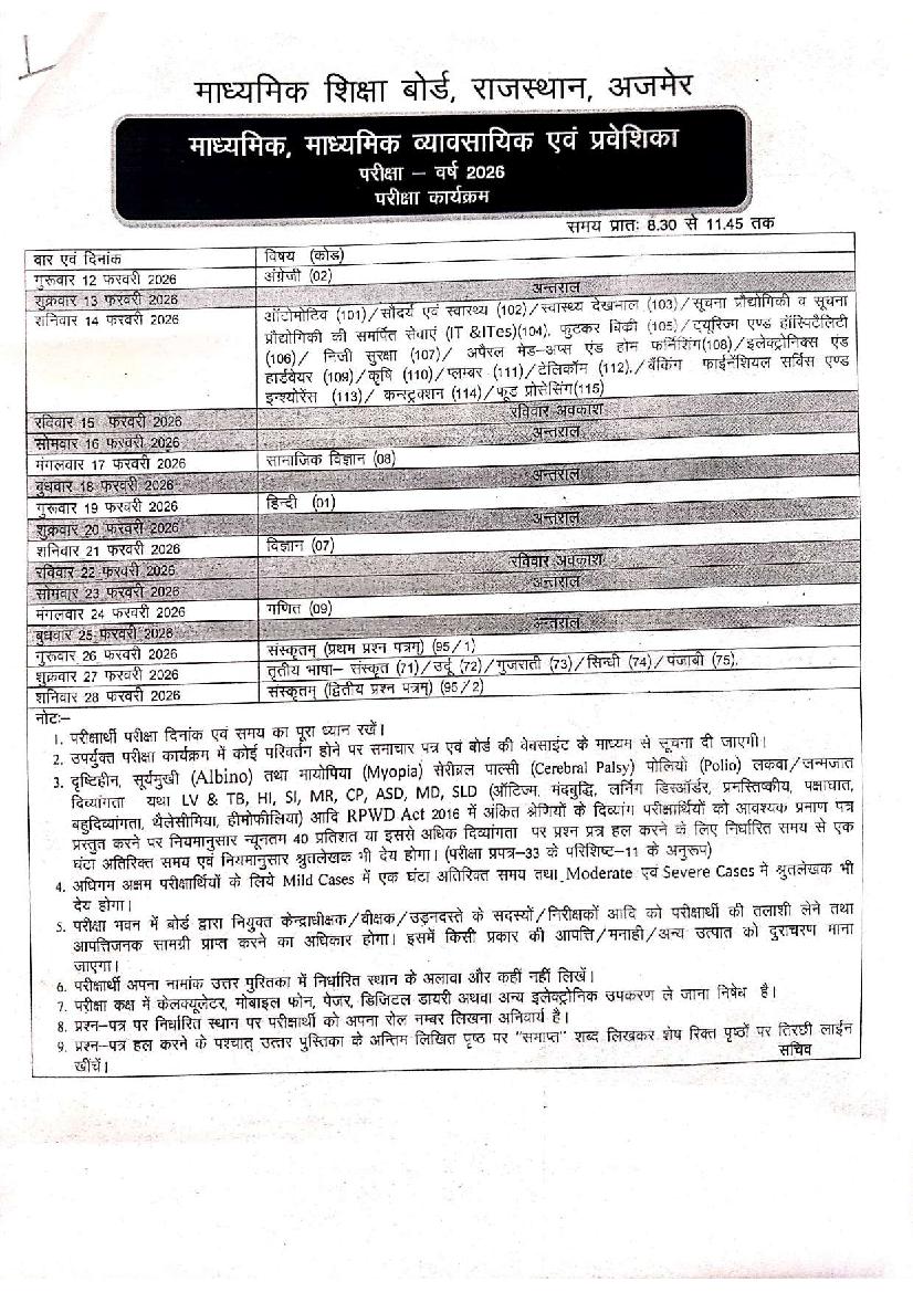 Latest: – RBSE 10th Time Table 2026 has been released. Scroll down to check the complete time table.