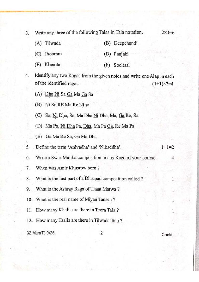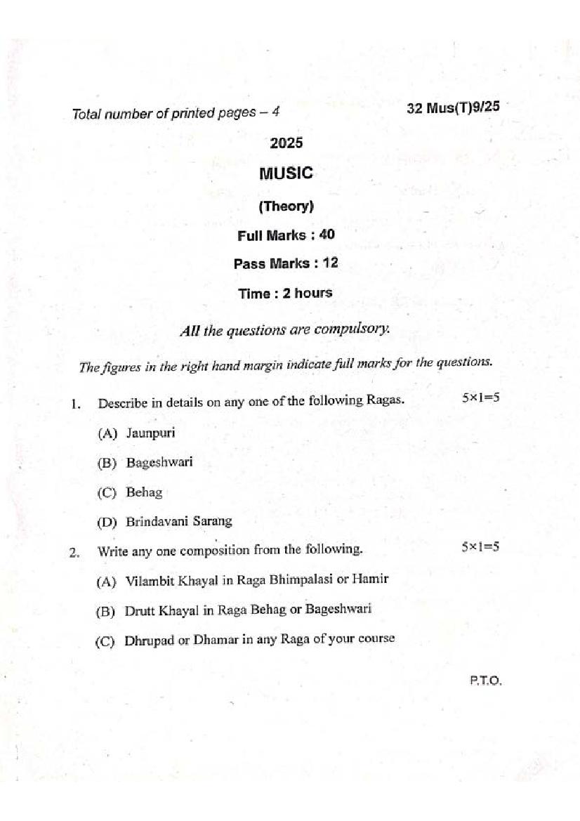 Manipur Board Class 12 Question Paper 2025 for Music View Download