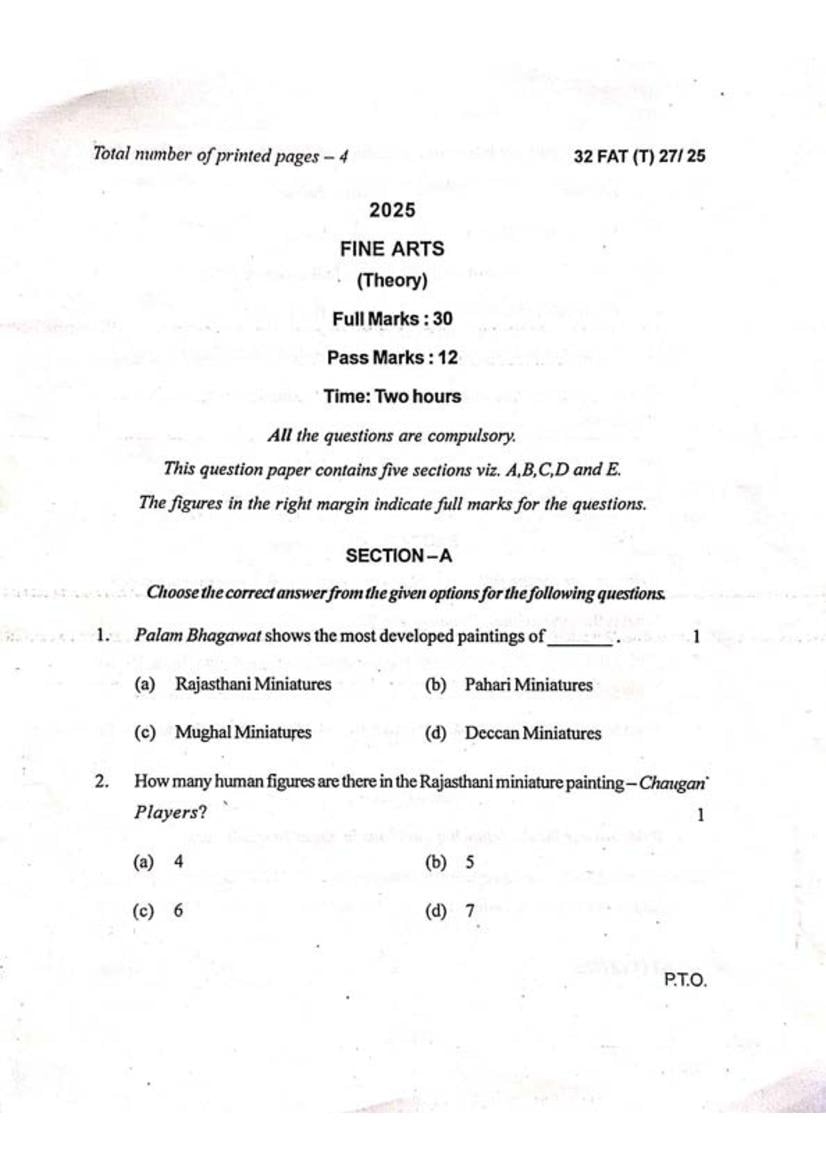 Manipur Board Class 12 Question Paper 2025 for Fine Arts View Download