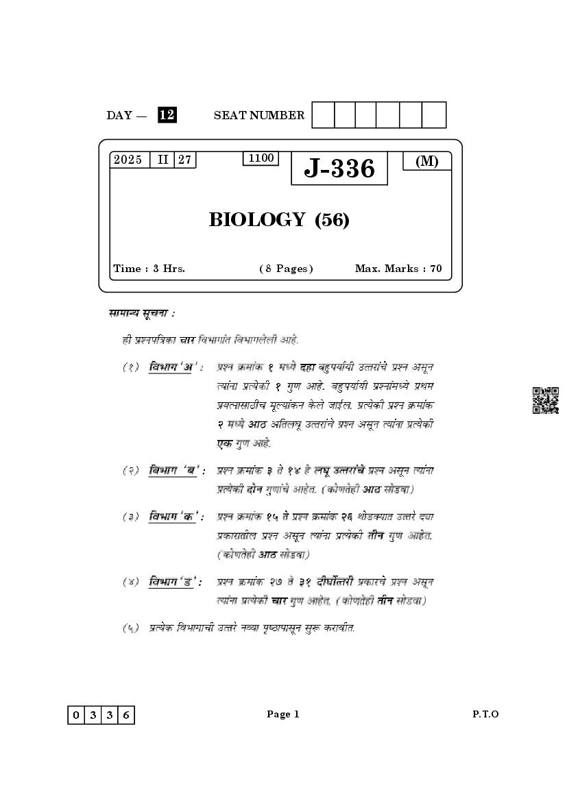 Maharashtra HSC Biology Question Paper 2025 Download Link – Click Here to Download Question Paper PDF