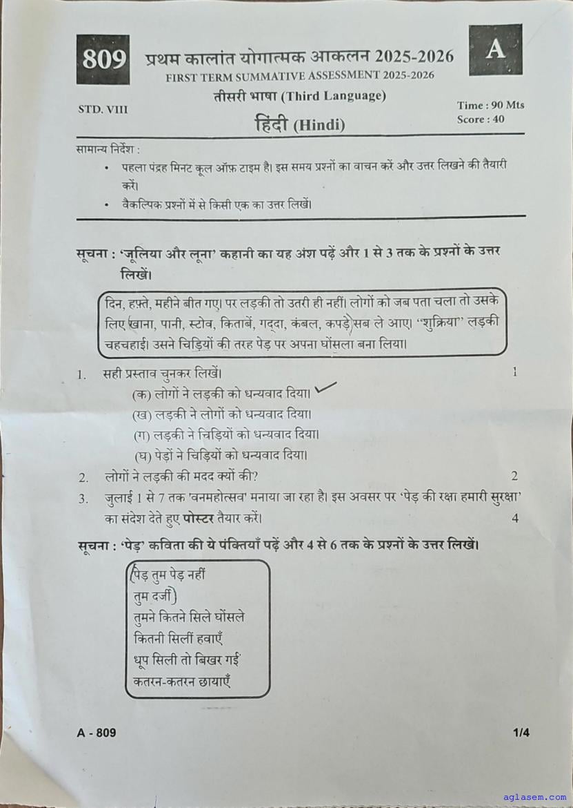 Class 8 Hindi Onam Exam Question Paper 2026 is published after exam. You can download the Kerala Std 8 First Term Hindi Question Paper PDF from here on aglasem. The latest and previous year question paper of Onam Exam for class 8 Hindi helps you prepare for the upcoming first term Hindi test. And after studying with this Kerala Syllabus 8th Standard Hindi Question Paper, you can download Onam Exam Question Paper for Class 8 for other subjects as well.