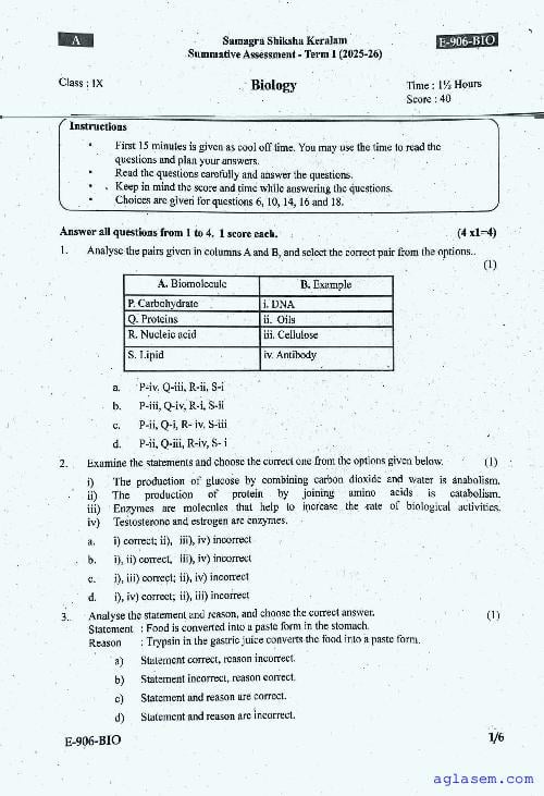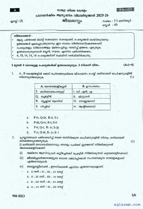 | Paper Here | Kerala Class 9 First Terminal Exam Biology Question Paper |