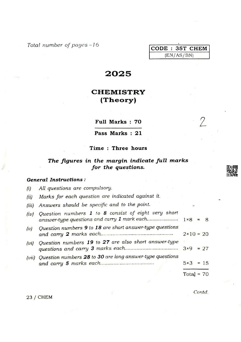 AHSEC Class 12 Chemistry Question Paper 2025 PDF